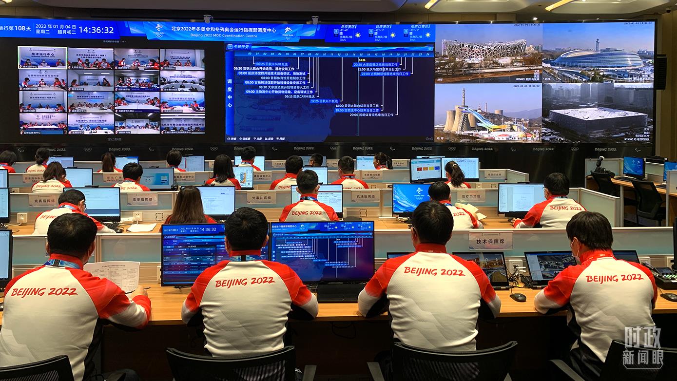 北京冬奧運行指揮部調度中心堪稱「冬奧大腦」,這裏既是指揮中樞,也是信息匯聚地。30餘米長的四塊大屏幕展現賽時場館運行實時畫面,指揮部可實時了解涉奧場館場所運行狀況。