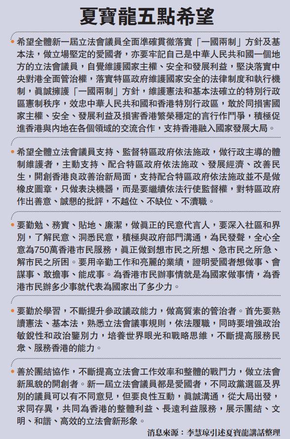 夏寶龍亦對新一屆立法會議員提出五點希望,包括希望議員做立場堅定的愛國者、行政主導體制的維護者、真正的民意代言人、高質素的管治者,以及立法會新風貌的開創者。一眾議員紛紛表示,未來定將盡職履責,不負使命。