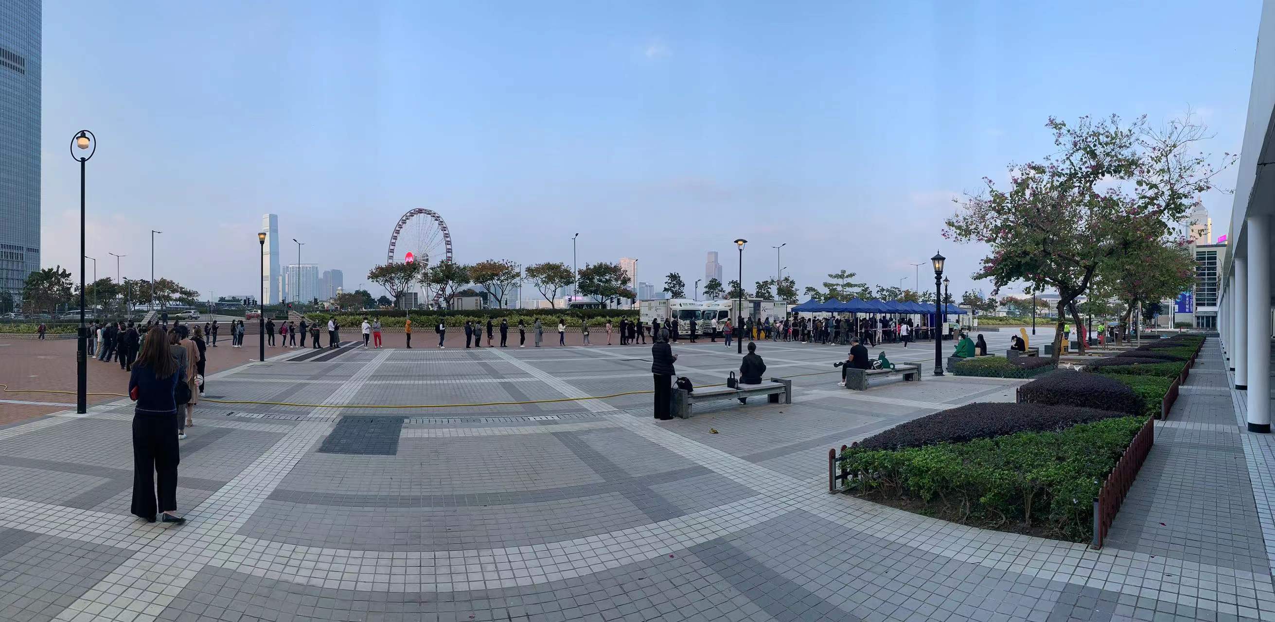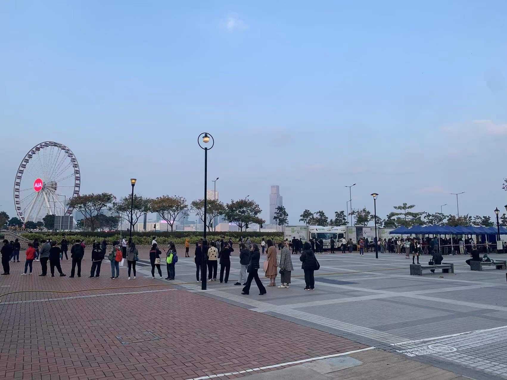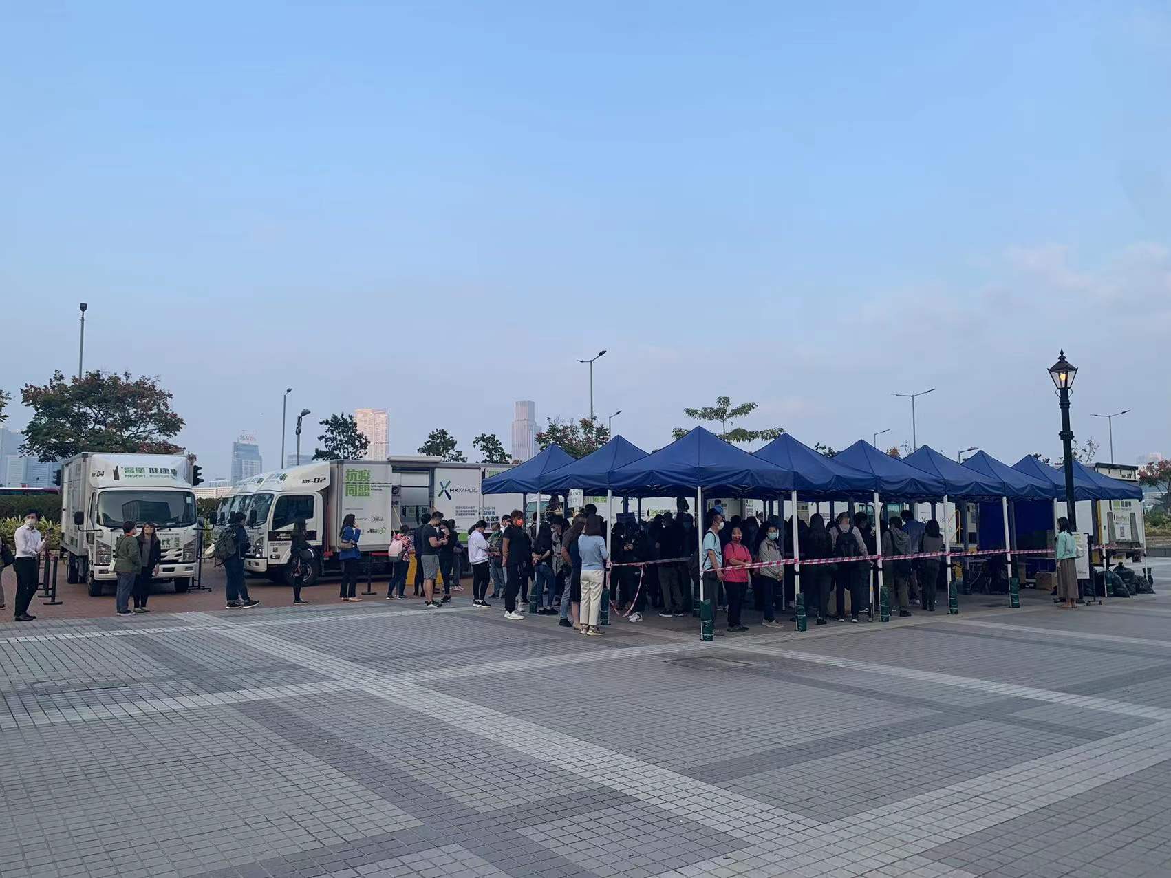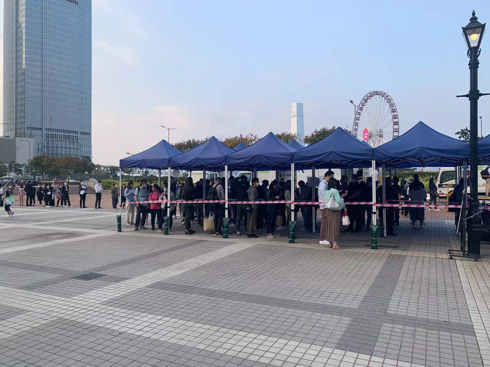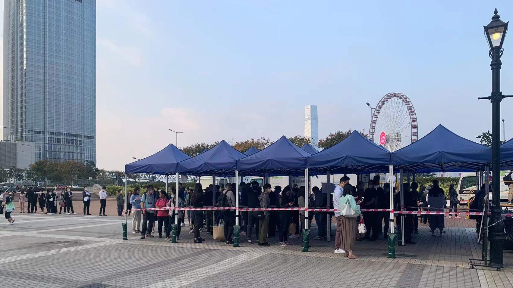 大公文匯全媒體報道,本港首次發現Omicron變種病毒本地傳播,政府今日(6日)凌晨公布強制檢測公告,表示因應五宗可能與輸入個案有流行病學關連的個案,有41個指明地方被納入強制檢測公告,包括維多利亞公園、工展會、銅鑼灣崇光百貨和港島智能身份證換領中心等,涉及的個案相信與昨晚天后翠巒閣、北角和富中心15座和又一村樂景樓封區的患者有關,均涉由國泰空姐引發的「維園跳舞」群組。今日全港各區合共30個地點設有社區檢測中心及流動採樣站,今日多個檢測點出現人龍,中環愛丁堡廣場流動採樣站更由早上到下午均見人龍,市民需等候1至2小時才能做到檢測。
