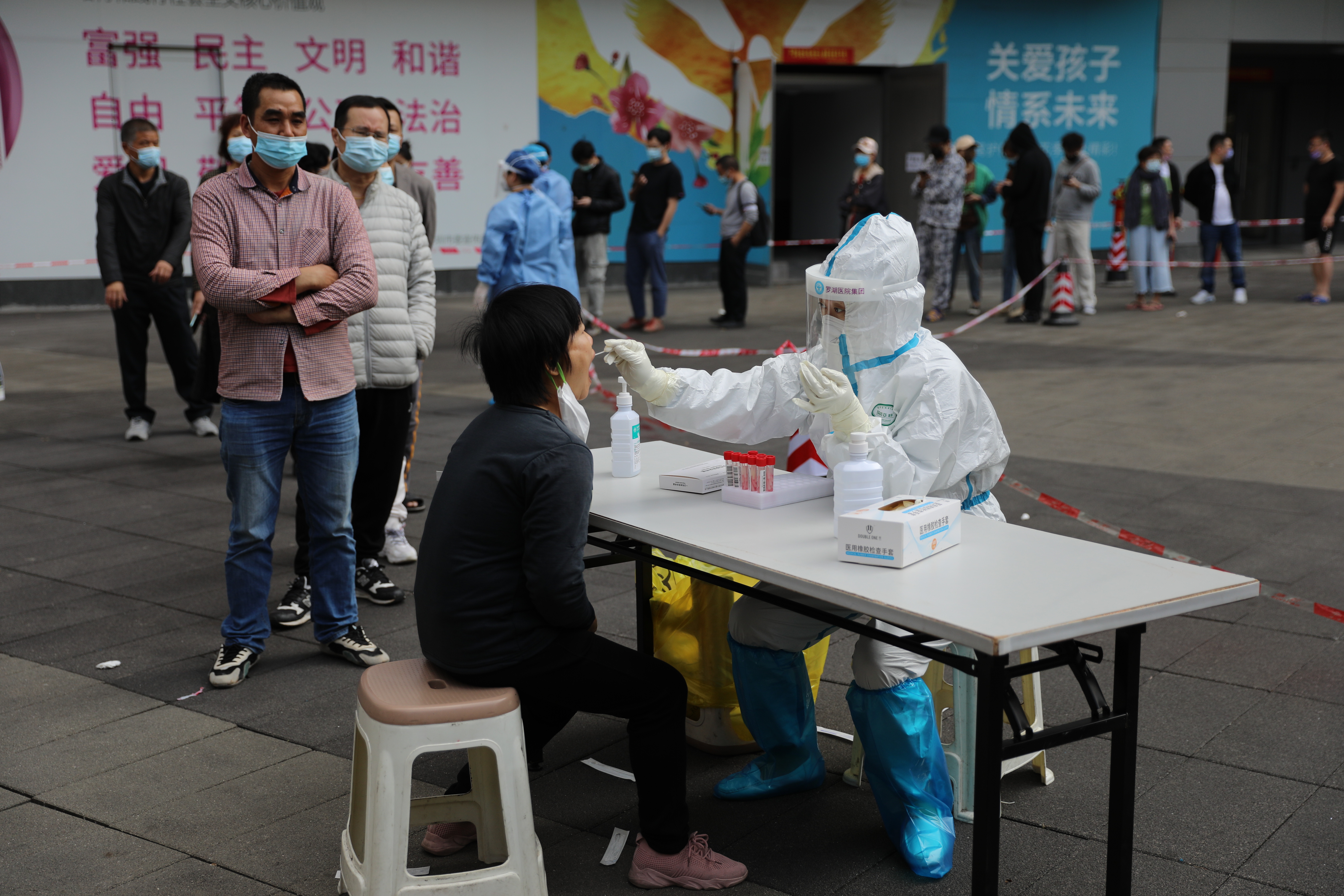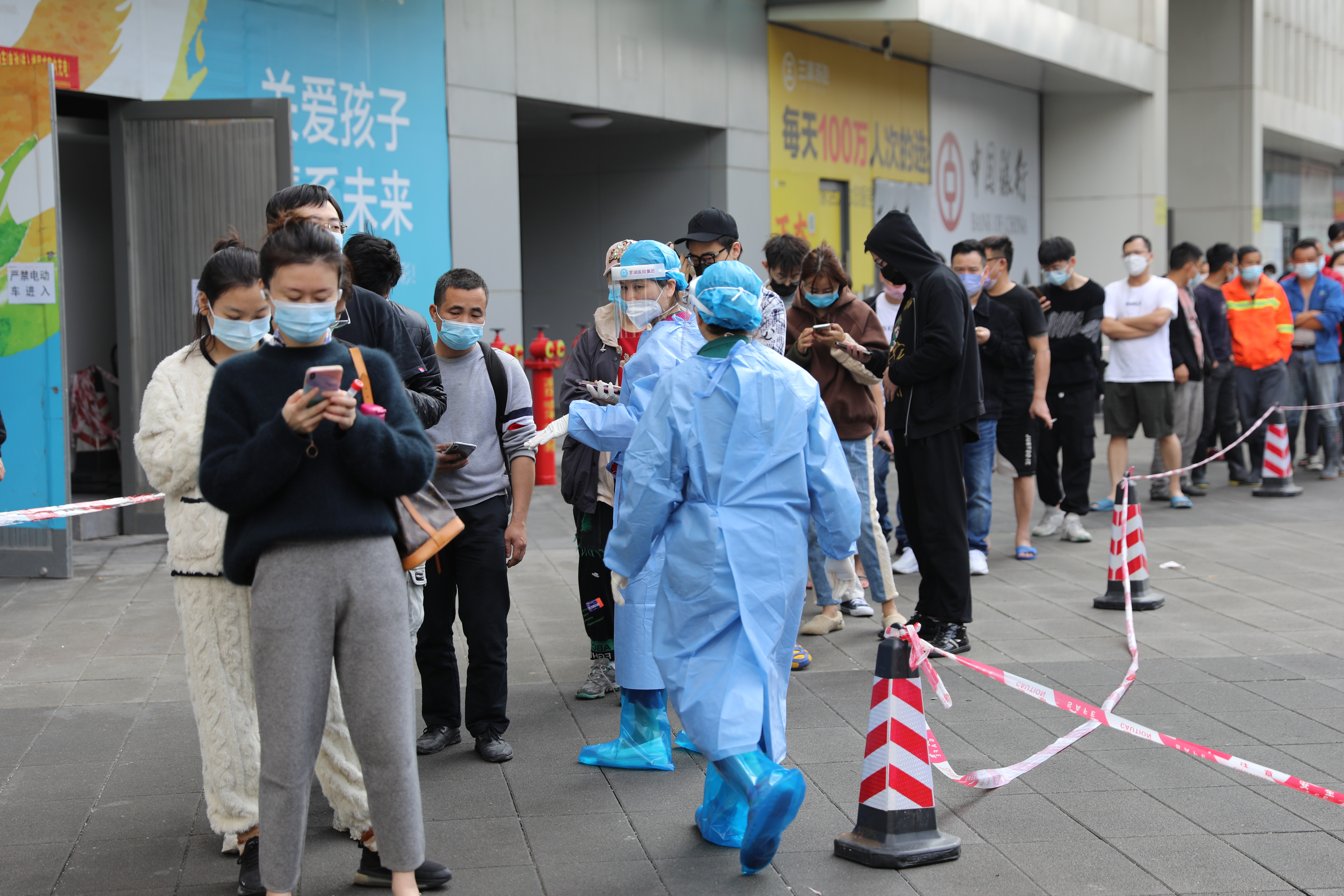 「一會下班估計要公交加騎單車回家了。」港人孫先生在蓮塘附近上班,利用午休時間外出在蓮塘口岸附近的新世界四季御園小區排隊做核酸,一個多小時才做完採樣。受疫情影響,他所在公司已安排員工臨時居家辦公,並要求所有人都在今日完成一次核酸檢測。孫先生表示,深圳應對疫情迅速,相信能積極應對。