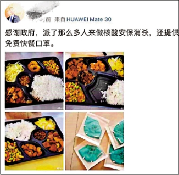 在深圳羅湖、龍崗兩區的多個封控管控區域內,數萬人正在居家隔離,相關街道組建工作專班,為群眾提供早、午、晚餐,並配送生活用品,保障區域內居民的正常生活需求。2名確診病例的居住地──龍崗布吉壹村冬心嶺社區已實施全村圍合管控,大量物資存放在東心嶺牌坊處,社區為隔離人員提供免費的五菜一飯一湯、口罩等。