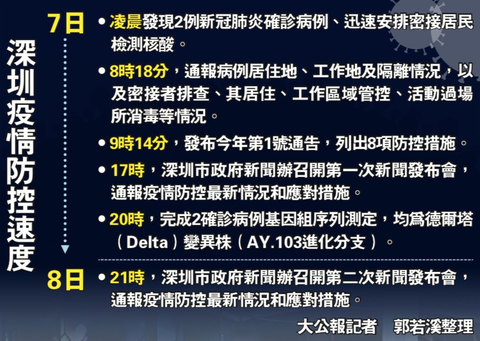 (大公報記者 郭若溪)1月8日21時,深圳舉行第二場疫情防控新聞發布會,深圳市衞健委副主任朱武通報稱,8日在密切接觸者核酸檢測中,發現一名新冠肺炎確診病例,全市已累計報告3例,目前初步判定為一起境外輸入關聯的本土疫情,是德爾塔(Delta)毒株。自8日21時起,深圳市龍崗區布吉街道、吉華街道內兩區域調整為中風險地區。深圳人性化的措施讓防疫更有溫度,為做好核酸採集工作,一名醫護人員在3小時重複了600多次起立、彎腰、採樣的動作;很多核酸檢測點也為老人、孩子和孕婦等特殊人群,開設優先檢測的綠色通道。