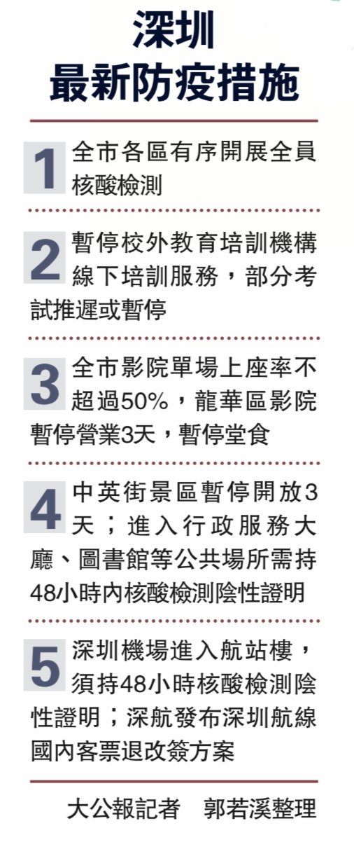 深圳市防控領導小組召開會議,部署防疫工作,強調要全面貫徹動態清零總方針,舉全市之力,加強防控工作,維護城市安全有序運行。即時加大力度,全力做好患者救治、流行病學調查溯源及隔離封控等工作,防止疫情擴散蔓延。緊盯口岸常態化防控,嚴格離境人員管理,做好深港聯防聯控。