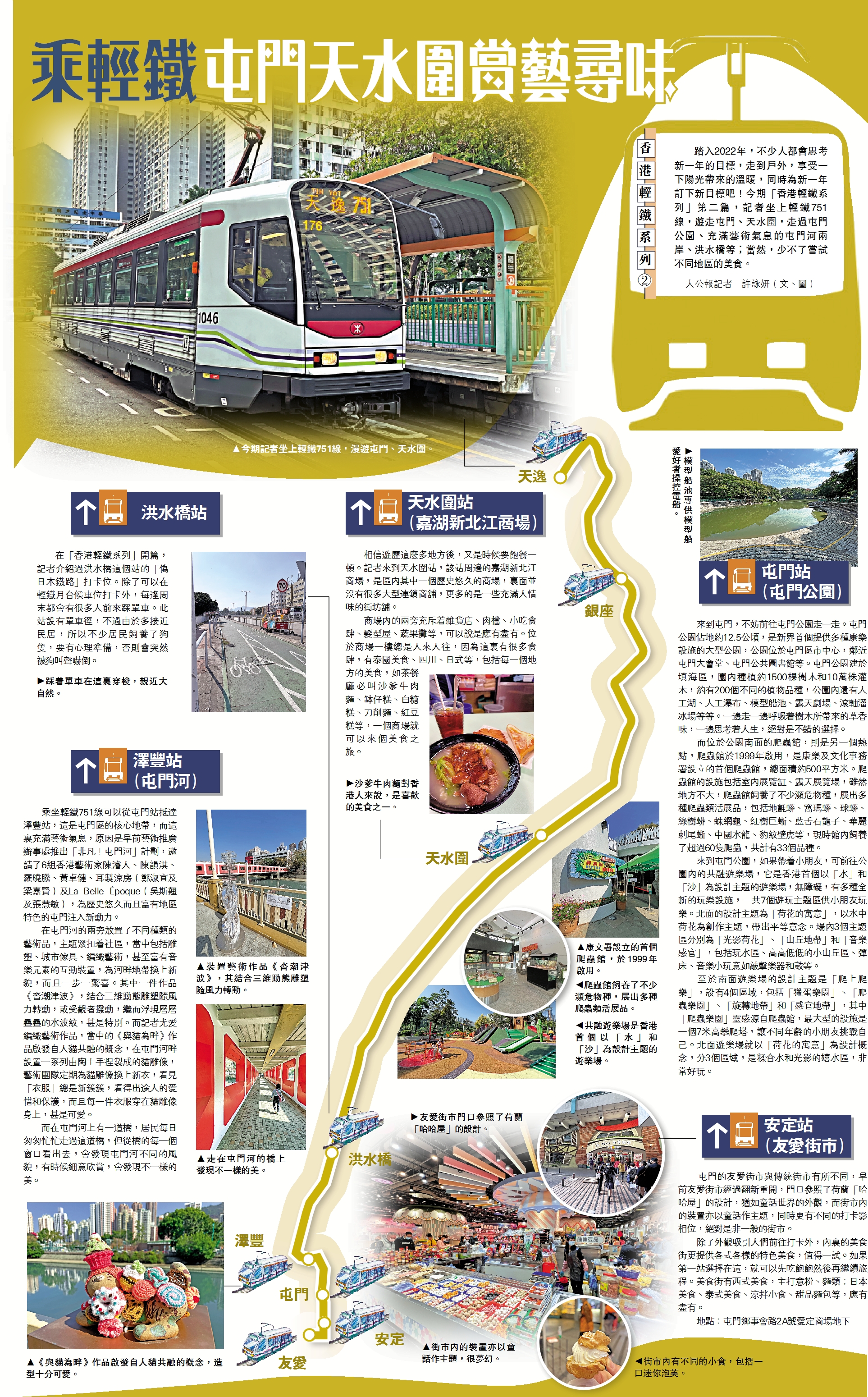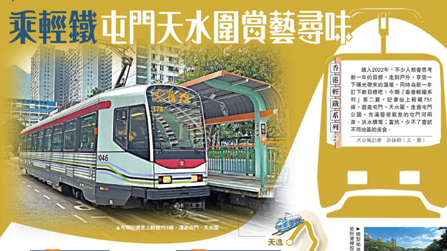 (大公報 記者 許詠妍)踏入2022年,不少人都會思考新一年的目標,走到戶外,享受一下陽光帶來的溫暖,同時為新一年訂下新目標吧!今期「香港輕鐵系列」第二篇,記者坐上輕鐵751線,遊走屯門、天水圍,走過屯門公園、充滿藝術氣息的屯門河兩岸、洪水橋等;當然,少不了嘗試不同地區的美食。