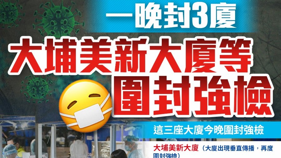 大公文匯全媒體報道,Omicron變種病毒殺入社區,本港存在多條隱形傳播鏈。政府今晚(9日)連封三座大廈進行強制檢測,分別是大埔舊墟美新大廈、屯門愛琴海岸8座、大角咀君匯港2座,政府目標是在明早(10日)完成圍封強檢行動。三座大廈均有初步陽性檢測個案居住,且初步顯示都涉及變異病毒株,政府經評估後相關區域感染風險有機會較高。