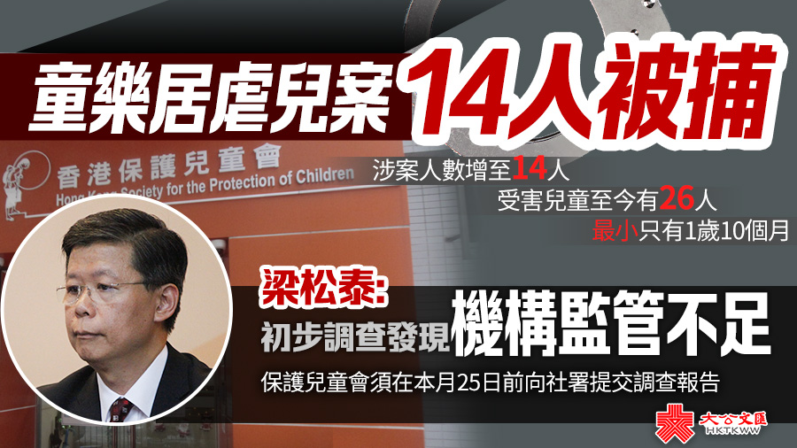 大公文匯全媒體報道,香港保護兒童會「童樂居」懷疑虐兒案涉嫌施虐者愈揭愈多,警方上周六宣布再多8名幼兒工作人員被捕,涉案人數增至14人,受害兒童至今有26人,年紀最小只有1歲10個月。社會福利署署長梁松泰接受傳媒訪問時表示,保護兒童會須在本月25日前向社署提交調查報告,當局會研究日後加入太平紳士等獨立人士巡視兒童院舍。