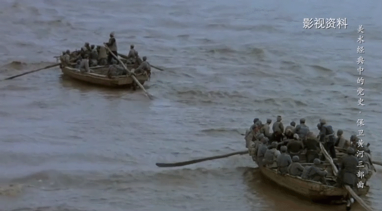 畫面上方是氣勢磅礴、洶湧奔流的黃河,下方是滿載着八路軍戰士的木船,雕塑般的戰士們引吭高歌,情緒激昂。