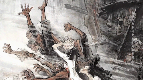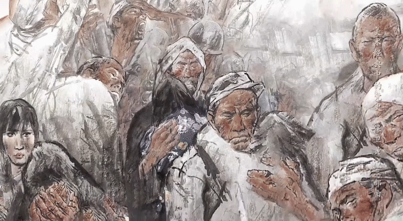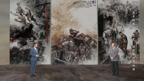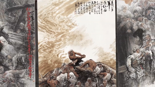 這幅畫作共分為三個部分。第一部分《百年家國恥》,畫家逼真地刻畫了被日本侵略者殘害的中國平民、南京大屠殺的凄慘場景。