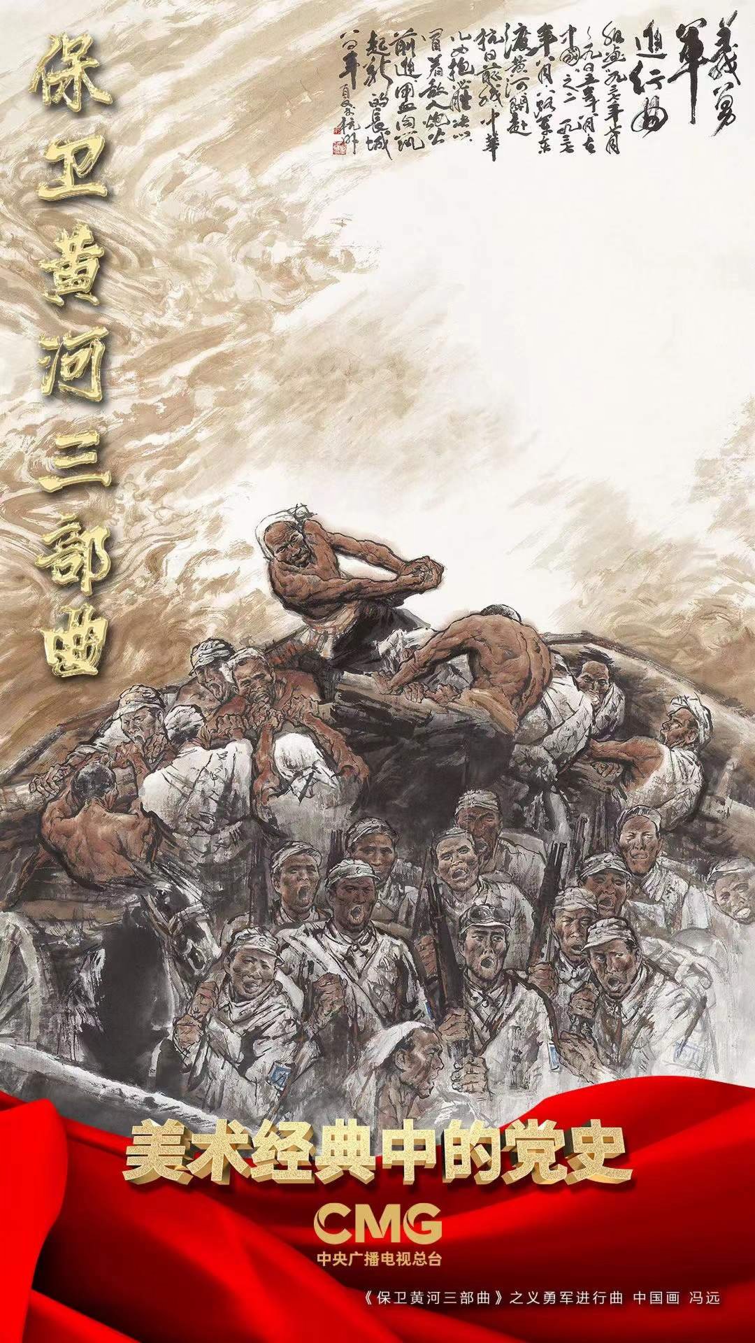 第二部分《義勇軍進行曲》,畫家選擇了1937年8月八路軍東渡黃河開赴抗日前線的英雄壯舉。