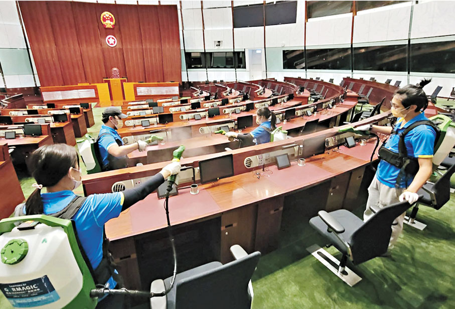 梁君彥表示,開會前一天,與秘書處同事舉行預備會。為使大家百分百放心,已吩咐秘書處安排今天在會議廳、其他會議室、餐廳等人流較多的地點噴灑消毒塗層。