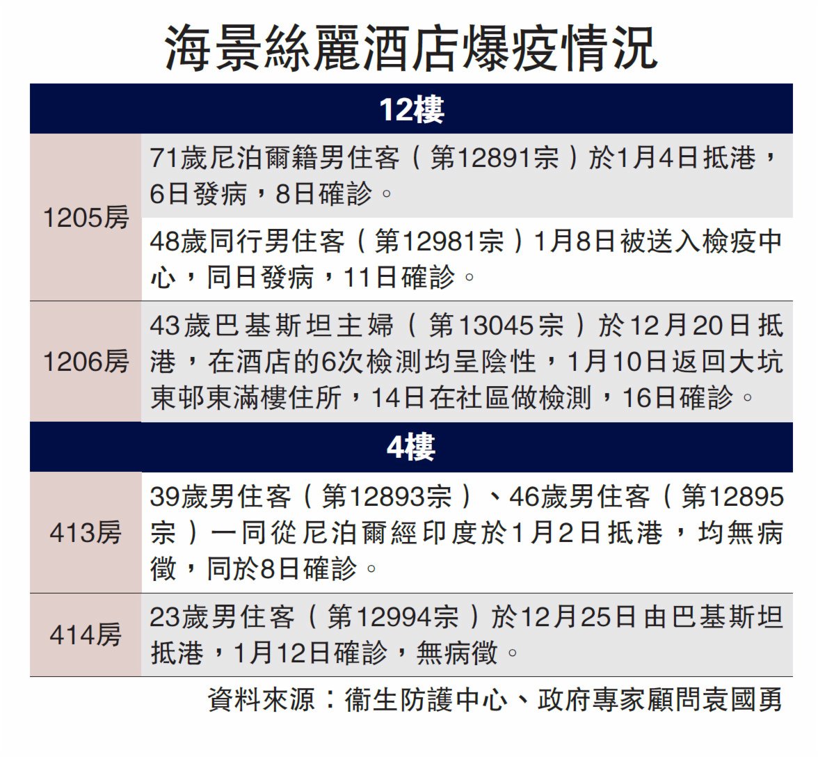 (大公報記者 邵穎、梁淑貞)疫情未止,檢疫酒店竟成播疫酒店!本港兩個月內出現第三宗檢疫酒店內感染事件,在油麻地的香港海景絲麗酒店,9日內先後有6人確診變種病毒,涉及兩個樓層共4個房間。其中曾住酒店12樓的43歲巴基斯坦女子(第13045宗)檢疫期間,疑被鄰房71歲尼泊爾男子(第12891宗)與其48歲男友人(第12981宗)傳染,她返回九龍大坑東寓所後4日,檢測後呈陽性,屬Omicron個案,而該酒店4樓亦有3名住客先後中招。