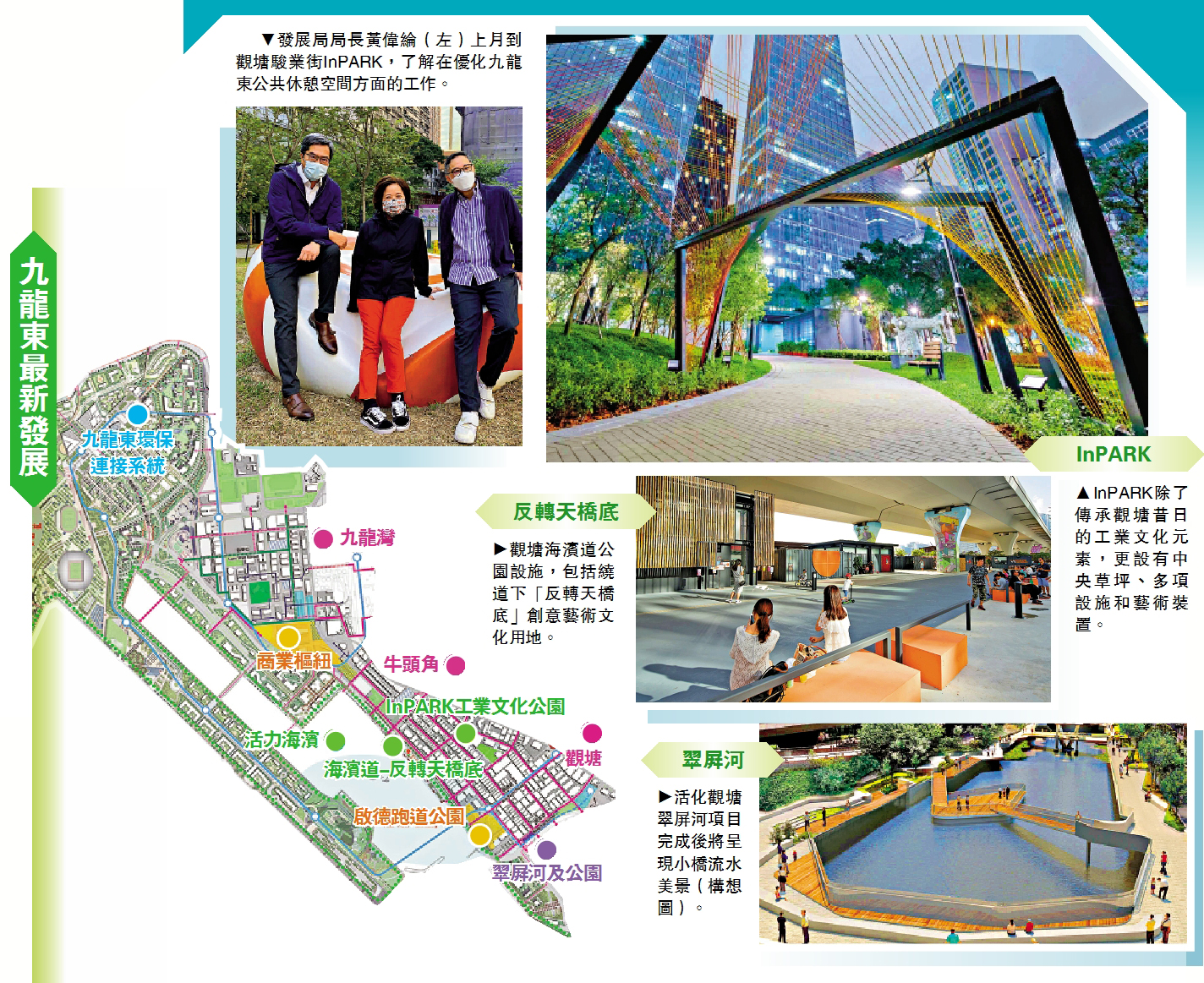 (大公報記者 王亞毛)「起動九龍東」計劃推行近十年,新增或翻新區內逾17公頃公共休憩空間,面積接近一個維園,其中有近期落成的InPARK主題公園,更有昔日工業主題的藝術裝置,市民休憩之餘,也能感受充滿工業文化元素的藝術氛圍。發展局局長黃偉綸昨表示,當一些規劃項目發展完成後,九龍東的商業規模將可媲美中環核心商業區。