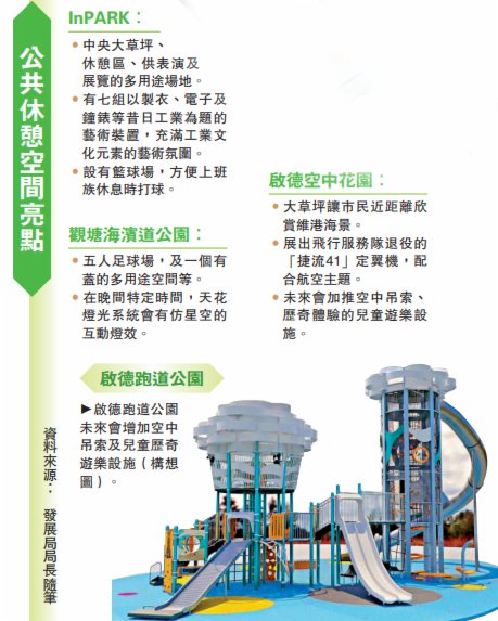 其中InPARK的前身為建於1973年的駿業街遊樂場,後來跟隨工廠密集的工業區轉型亦作出改善,已經由一個硬地球場,變身為以工業文化為主題的公園。張綺薇介紹,除了中央的大草坪,休憩區和供表演及展覽的多用途場地,另有七組以九龍東昔日的製衣成衣、電子、鐘錶等工業為題的藝術裝置,市民休憩之餘,也能感受充滿工業文化元素的藝術氛圍。公園亦設有籃球場,方便上班一族休息時落場打球。
