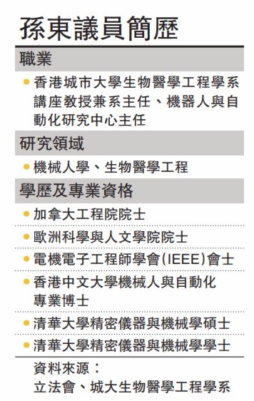 (大公報記者 吳俊宏、黃釔淼、賀仁)由「得天下英才而教育之」的大學教授,到成為特區立法會的一員,立法會選委會界別「新丁」議員、城市大學生物醫學工程學系講座教授孫東近日在接受《大公報》專訪時表示,香港經濟結構過分單一,迫切需要建立自己的優勢產業,他在議會工作的重點首先是推動創科,爭取香港增加科研投入,以及研究如何引進資金。