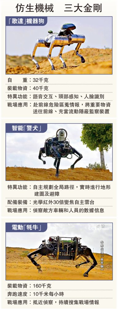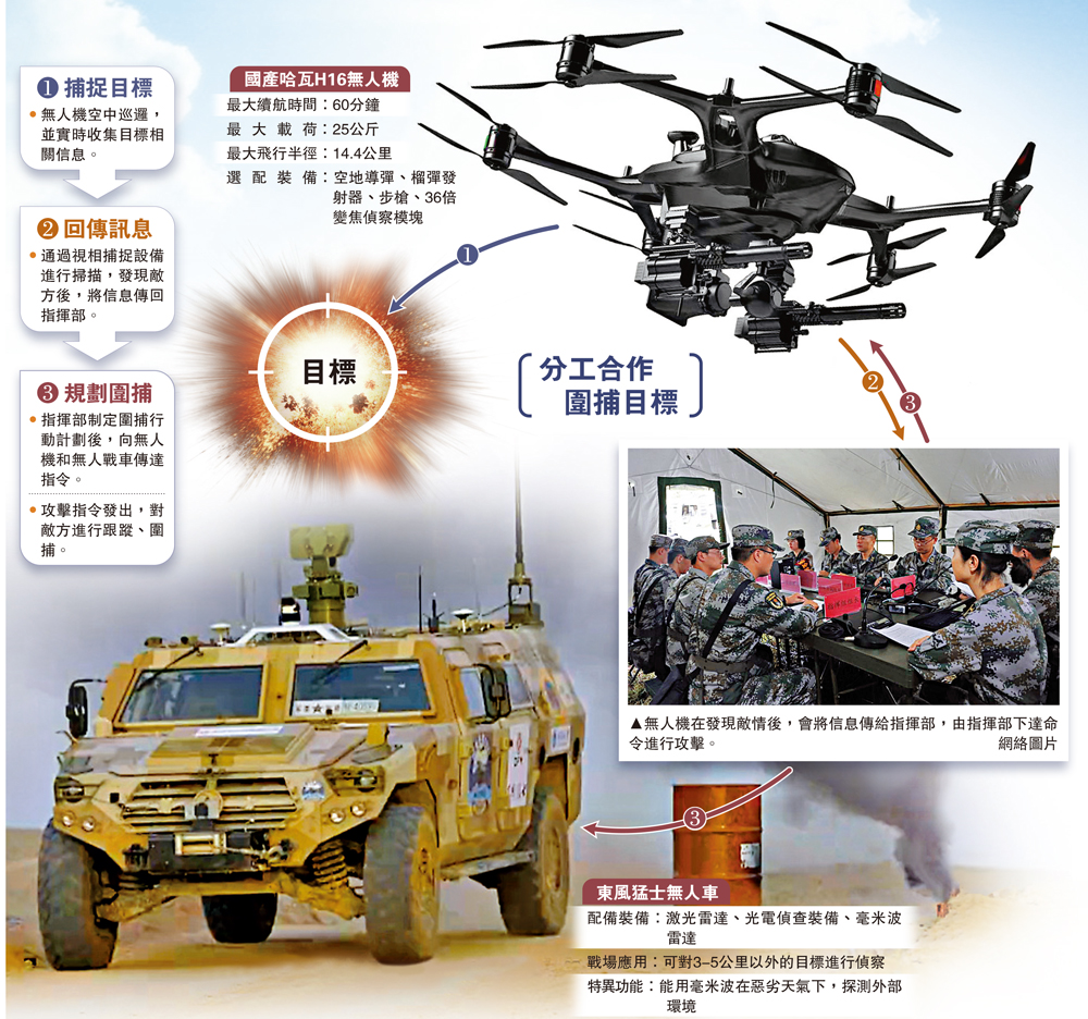 (大公報記者 馬浩亮)陸軍無人作戰系統近些年飛速躍升。無人機、無人防雷車、東風猛士無人車、「山貓」四輪全地形無人車、「新龍馬二號」山地運輸車、電動「牦牛」等各種形態的智能無人武器,能夠在各種複雜的戰場環境中,執行運輸、偵察、打擊等不同任務。它們將重塑作戰模式,並成為未來戰場不可或缺的重要力量。無人機與無人車聯手出擊,可以實時監控敵情。一旦無人機發現目標,可不間斷進行追蹤,並將信息回傳,東風猛士無人車接獲情報後可以火速出擊,協同智能機械戰隊成員對目標實施精準打擊。