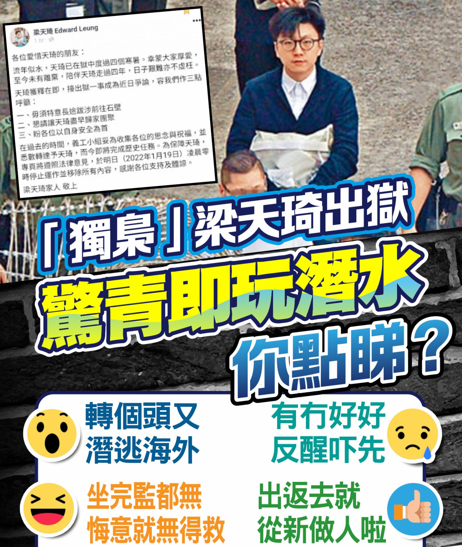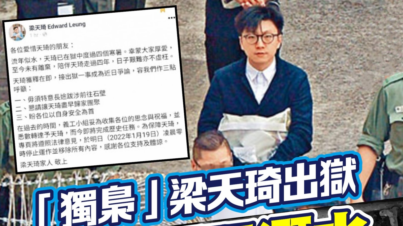 大公文匯全媒體報道,因參與2016年新年旺角暴動,被判囚6年的「獨梟」梁天琦,於今日離開大嶼山石壁監獄。由於他身份敏感,外界預料會有大批人士及傳媒追訪,於是梁天琦家人昨(18日)在fb發文呼籲,毋須特意長途跋涉前往石壁接梁天琦出獄,以及讓他盡早歸家團聚等。而有關專頁將遵照法律意見,聲稱今日凌晨零時停止運作並移除所有內容,話係為保障梁天琦喎。