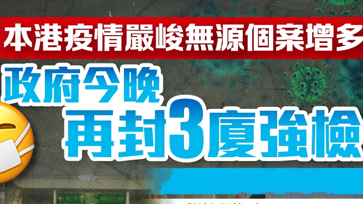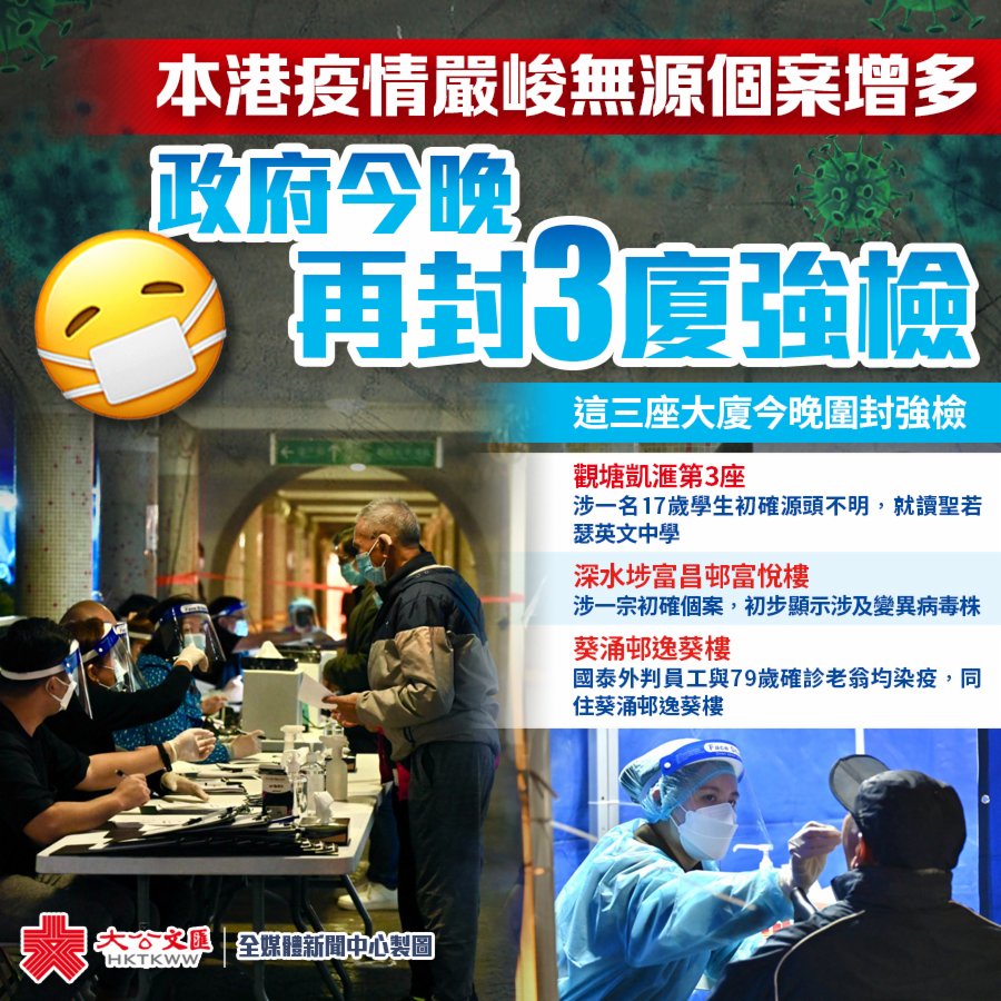 大公文匯全媒體報道,本港第五波疫情日益嚴峻,社區先後出現Omicron及Delta兩種病毒的隱形傳播鏈。政府今晚(19日)連封三座大廈進行強制檢測,分別是觀塘協和街33號凱滙第3座、深水埗富昌邨富悅樓及葵涌邨逸葵樓,政府目標是在明早(20日)完成圍封強檢行動。政府指,三座大廈均有初步陽性檢測個案居住,且初步顯示涉及變異病毒株,政府經評估後相關區域感染風險有機會較高,於今晚展開圍封強檢行動。