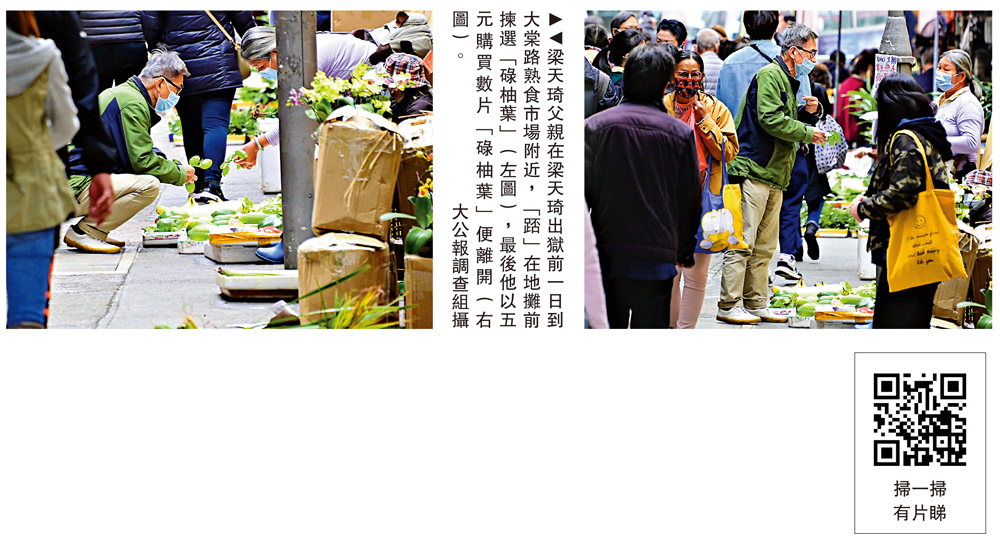 據讀者爆料,梁天琦父親在1月18日下午到大棠路熟食市場附近,「踎」在地攤前揀選「碌柚葉」,最後以5元購買數塊便離開。攤檔女子表示,「這些『碌柚葉』早上才摘下來,很新鮮,可以辟邪!」相信梁父買「碌柚葉」是為了給梁天琦洗走衰氣。