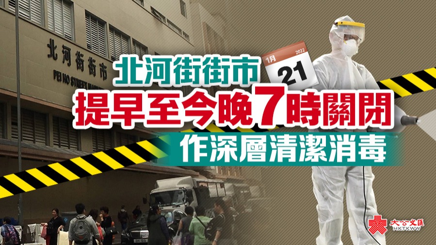 大公文匯全媒體報道,食環署今日(21日)宣布,因應政府昨日發出的強制檢測公告,指明曾於指明期間及時段身處圍繞北河街市政大廈對開的人士須接受強制檢測,為保障街市檔戶及市民的健康及安全,北河街街巿今日將提早1小時於晚上7時關閉作深層清潔消毒工作。
