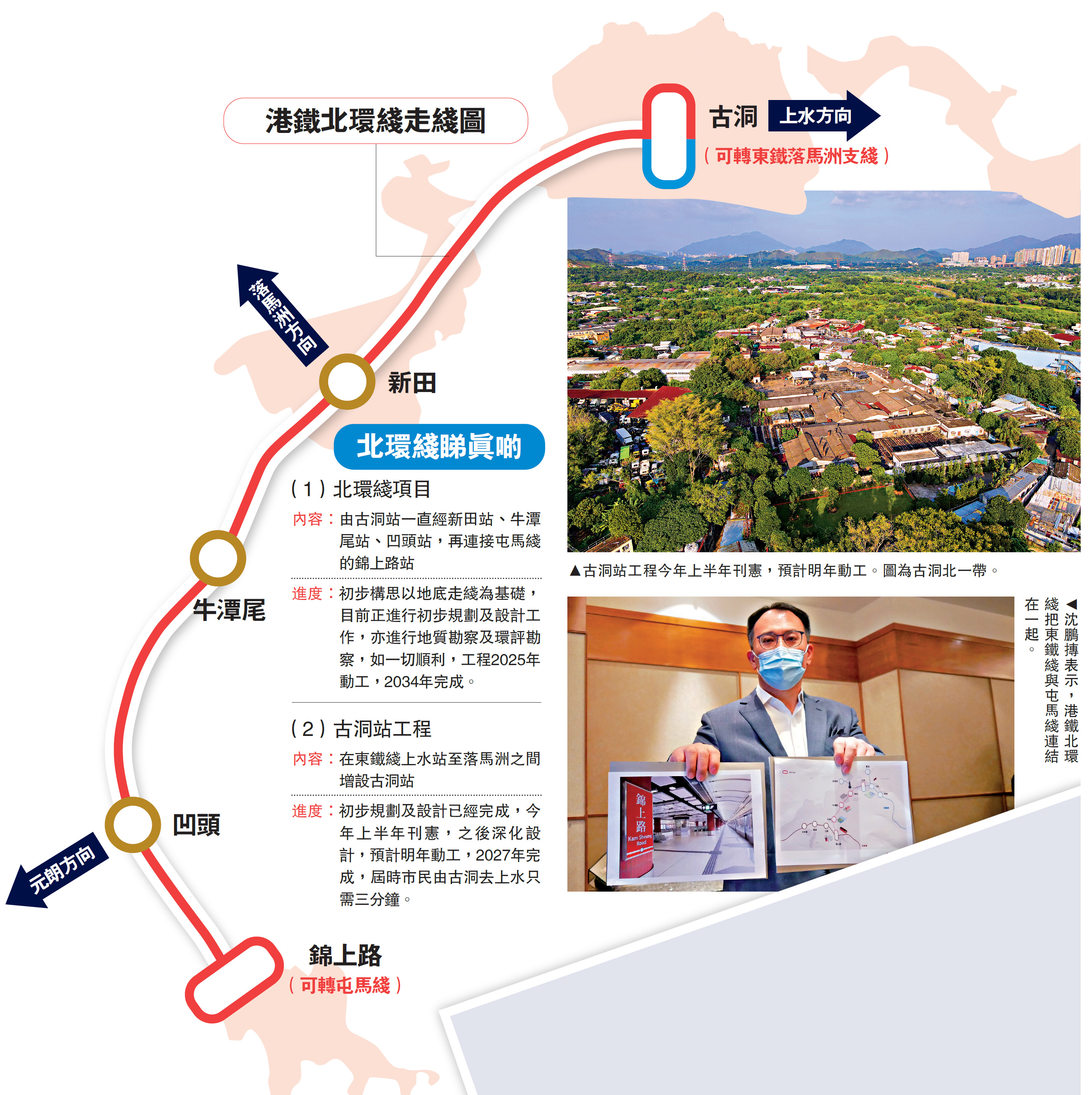 至於首階段古洞站工程,已初步規劃設計完成,今年上半年刊憲,預期明年動工,2027年完成。地底走線設計可避免對濕地造成影響,對收地賠償與爭議也會較少。