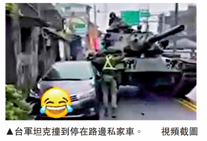 據報道,島內網上21日傳出一段「坦克擦撞自小客(私家車)」的視頻。一名車主自己在臉書發文稱,「買個咖啡出來,車子就被坦克撞了,不過我有超出白線一點,不知照則(交通規則)怎麼算?」此文引起網友熱議。