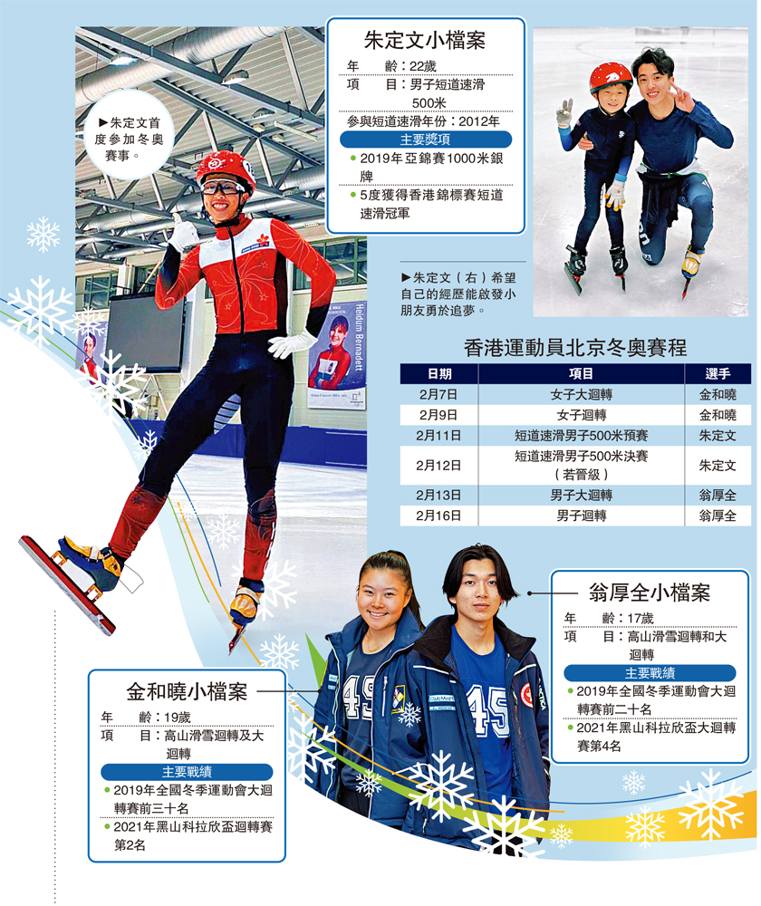 (大公報記者 張銳)距離四年一度的國際冰雪運動體壇盛事北京冬季奧運會還有不足兩周便隆重開幕。中國香港代表團今屆將有3名運動員參加賽事,他們是短道速滑男子500米的朱定文,男子高山滑雪大迴轉、迴轉的翁厚全,和女子高山滑雪大迴轉、迴轉的金和曉,3名年輕精英運動員屆時的表現備受期待。同時大公報記者亦訪問到中國香港滑雪總會主席余國賢,談談內地與香港冰雪運動的互通優勢,並呼籲市民在北京冬奧期間透過電視機,繼續支持國家隊和香港隊的運動員。