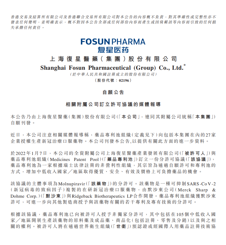 大公文匯全媒體報道,復必泰(Biontech)疫苗代理商上海復星醫藥今晚(23日)刊發公告,該公司的全資附屬公司上海復星醫藥產業發展有限公司,於本月7日與藥品專利池組織訂立一份分許可協議,該協議的主體事項為一款名為Molnupiravir的新冠治療口服藥物的分許可。