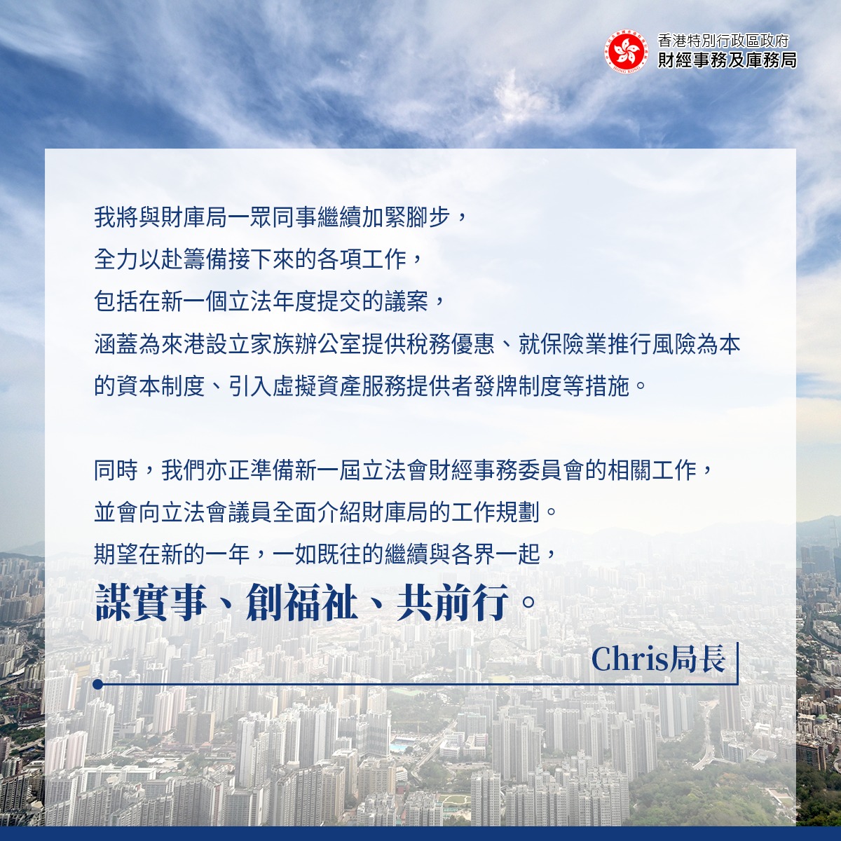 財庫局在社交網站發文,指許正宇過去一段日子,以視像形式與同事溝通,掌握最新工作進展,將繼續加緊腳步,全力以赴籌備接下來的各項工作,包括在新一個立法年度提交的議案,涵蓋為來港設立家族辦公室提供稅務優惠、就保險業推行風險為本的資本制度、引入虛擬資產服務提供者發牌制度等措施,亦準備新一屆立法會財經事務委員會的相關工作,並會向立法會議員全面介紹財庫局的工作規劃。