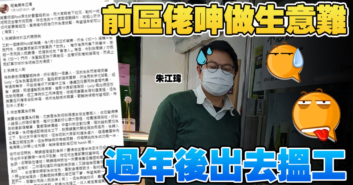 朱江瑋在帖文話,其實做生意真係好難,尤其是係佢呢啲唔適合做生意嘅人,雖然佢間舖開咗唔夠兩個月,請埋伙記之下都可以達到收支平衡仲有找,但佢都知道只不過係「虛火」,過埋農曆年先係真正嘅捱世界咁話。但係無論如何,農曆年過後,就會出去搵工,覺得收入肯定高過開舖喎。