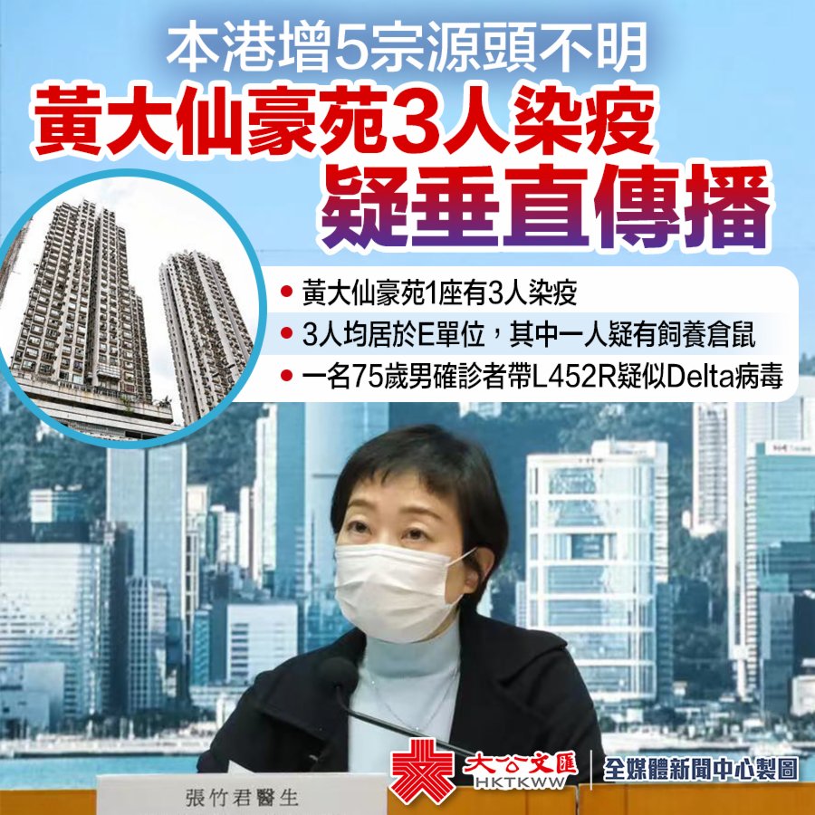 大公文匯全媒體報道,本港疫情嚴峻,衞生防護中心公布,今日(24日)新增109宗確診個案,包括98宗本地個案,當中24宗與相關個案,5宗源頭不明個案。衞生署衞生防護中心傳染病處主任張竹君張竹君表示,大窩口邨富強樓早前有一宗確診個案,涉及一名18歲學生,就讀地利亞修女紀念學校(吉利徑),當局今日再發現再多一宗初步確診,兩單位為樓上樓下同一方向,當局懷疑有垂直傳播,會派人前往調查。