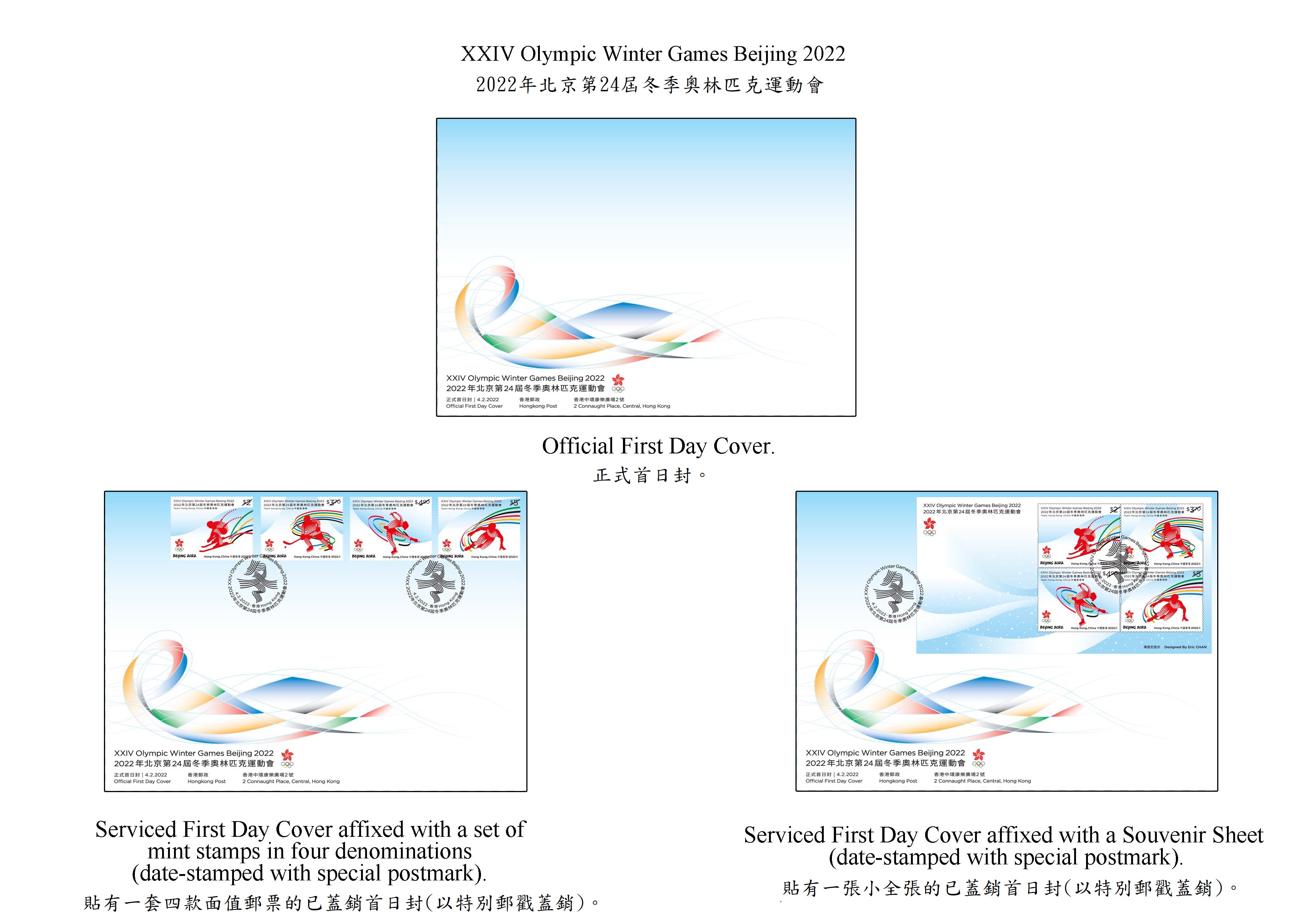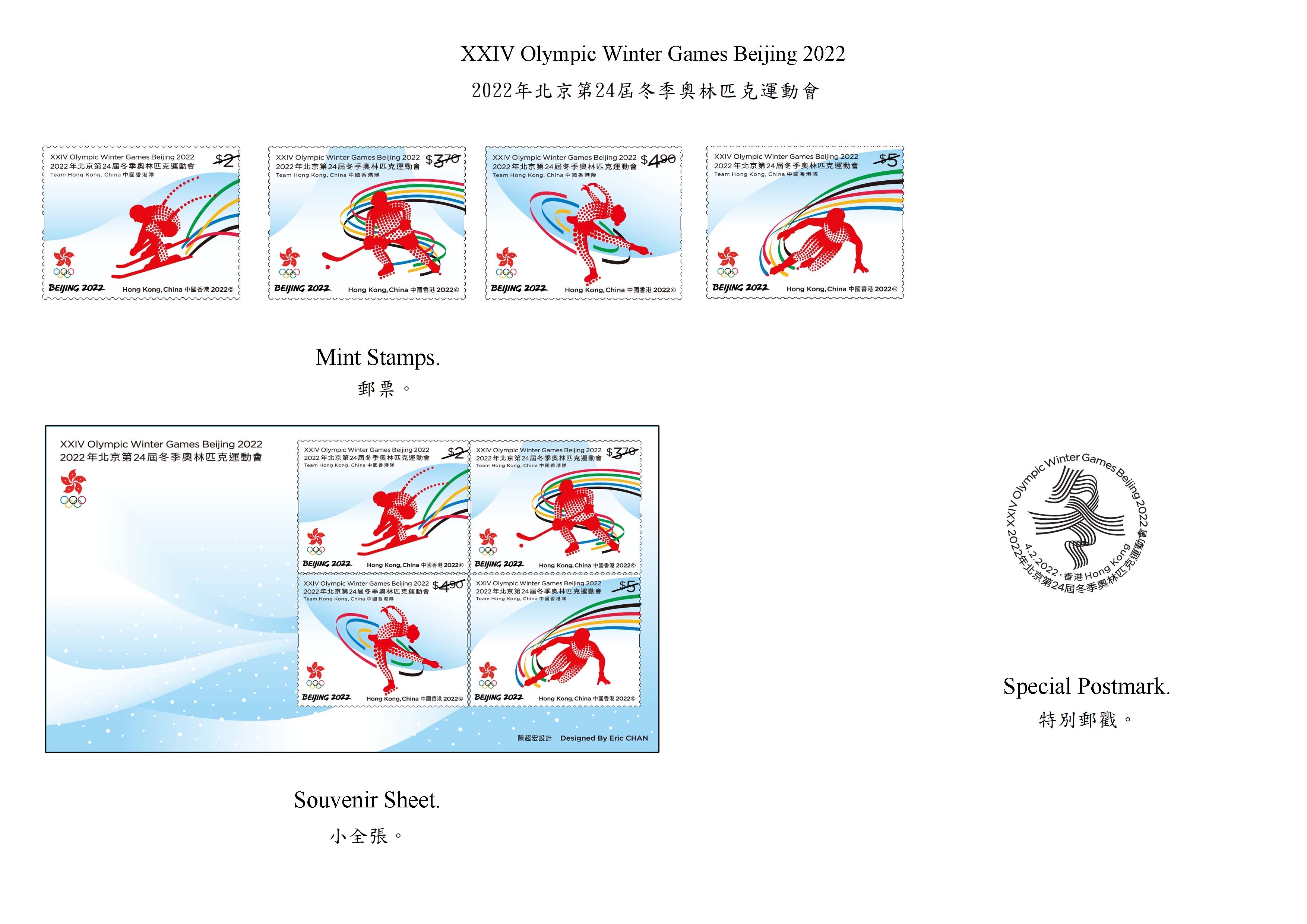 香港郵政指,是次發行的一套四枚特別郵票分別展示冬奧會的不同比賽項目,包括對運動員體能要求甚高的高山滑雪、講求速度和戰術的冰球(即冰上曲棍球)、集藝術和體育競技於一身的花樣滑冰,以及追求策略、膽識和技巧的短道速滑。每枚郵票均印有運動員的剪影,配以奧運五環色彩的流線,令設計倍添動感。