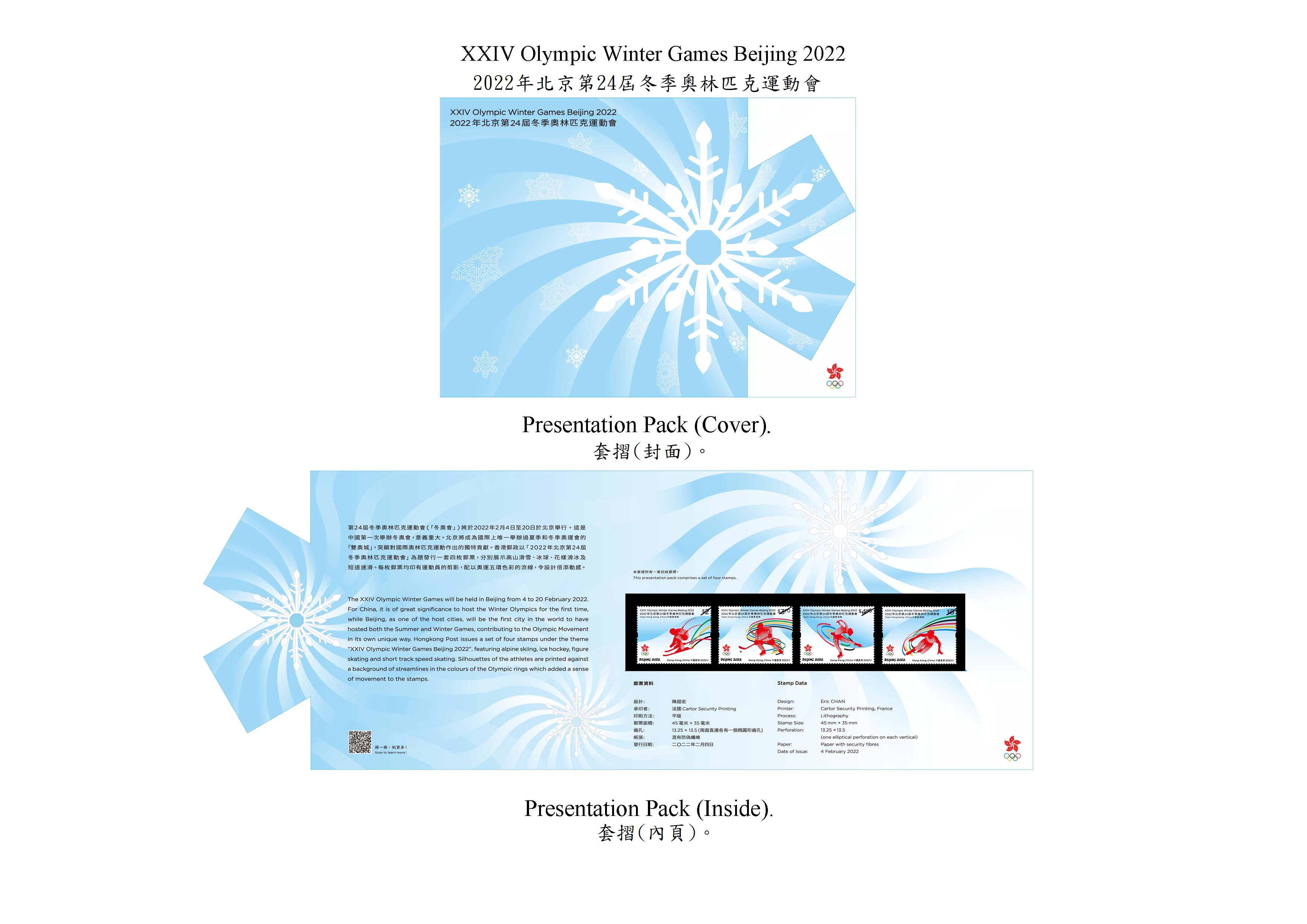 套摺設計亦以冬奧會的願景「純潔的冰雪,激情的約會」為靈感來源,使用冬奧會會徽上的藍色主色調,寓意夢想與未來,並以燙銀勾勒出冰雪部分,呈現明亮純潔的效果,令郵品更具收藏價值。