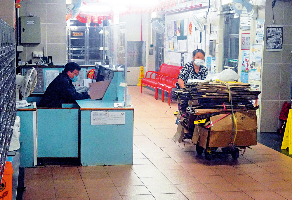 【大公報記者 邵穎、梁淑貞】第五波疫情持續升溫,保安員、清潔工人每日到樓宇各層巡樓或倒垃圾,接觸居民眾多,感染風險極高,亦容易成為傳播者,影響極廣。除葵涌邨、大窩口邨等多名保安員、清潔工人中招,昨新增107名確診患者中,一名居於黃大仙豪苑,在彩雲(一)邨長波樓工作的保安員中招,長波樓兩名住戶亦確診;機場職員洗手間女清潔工、37歲國泰城女安檢人員(第13613宗)、32歲太古城男保安員亦感染。有保安及清潔工會表示,希望僱主提供多些防疫保護裝備,並願意定期接受檢測。