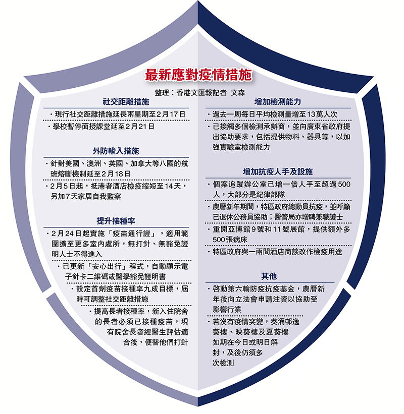 (香港文匯報記者 文森)香港備受Omicron及Delta變種病毒夾擊,昨日新增164宗新冠肺炎確診個案,是過去兩年爆疫以來單日最高紀錄,更累計已有超過30宗源頭不明個案。特區行政長官林鄭月娥昨日表示,這代表社區有逾30條隱形傳播鏈,個案隨時以幾何級數速度上升。由於疫情嚴峻,她宣布農曆年初四不能按原計劃放寬社交距離措施,將繼續延長措施兩周至下月17日,學校亦續要暫停面授課堂至下月21日,並透露全港首劑疫苗接種率要達九成才能調整各項措施。為鼓勵市民打針,下月24日推出的「疫苗通行證」將擴至大部分室內處所,巿民屆時要接種疫苗才能進入食肆等各室內處所,而長者及殘疾人士日後更要先打針才可入住院舍,逐步令首劑疫苗接種率達90%。