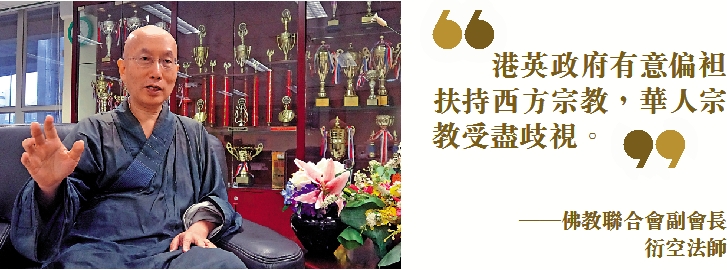 衍空法師指出,港英政府有意偏袒扶持西方宗教,華人宗教不受支持和保護,這可以從假期及資源分配上明顯看到。