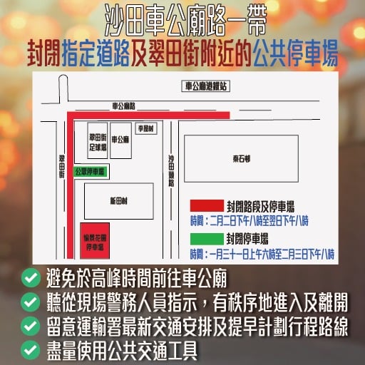 - 1月31日上午六時至2月3下午八時暫時封閉翠田街的公共停車場。