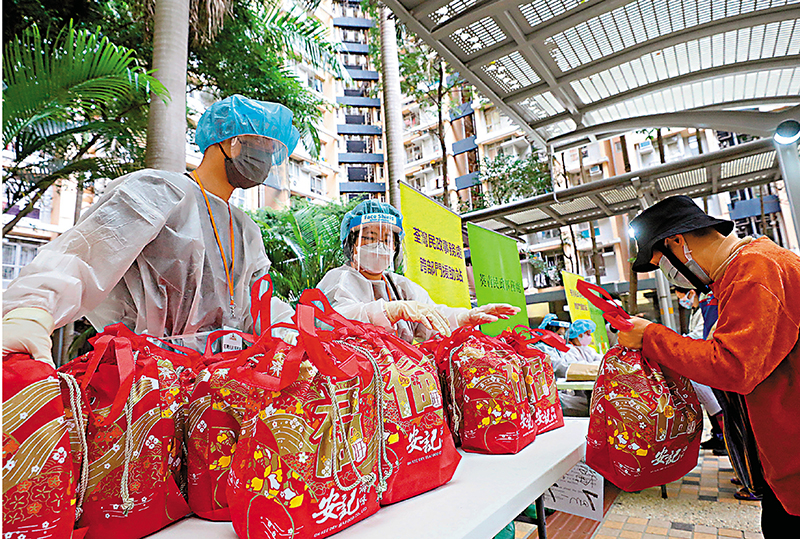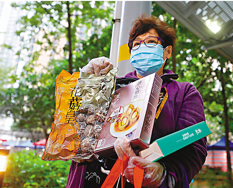 居民練小姐昨向香港文匯報記者展示「福袋」內的物品,包括鮑魚、鮑魚雞湯、花菇及臘腸。她直言,對終可「重獲自由」感到十分開心,同時感謝一眾政府人員連日的付出,又透露自己在今個農曆新年不會四出拜年,暫時「自行禁足」在家一段時間,「有心唔怕遲,日日都是拜年時。」