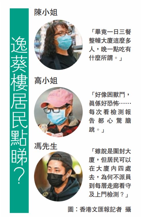 馮先生就直言是次的安排欠妥,「雖說是圍封大廈,但居民可以在大廈內四處去,為何不派員到每層走廊看守及上門檢測?」在圍封的第四天,才有人清理垃圾,「我明白許多清潔工去了隔離,但政府應有資源去做。」昨日,他發現後樓梯仍有不少煙蒂、紙巾等垃圾,應當繼續徹底清潔消毒。