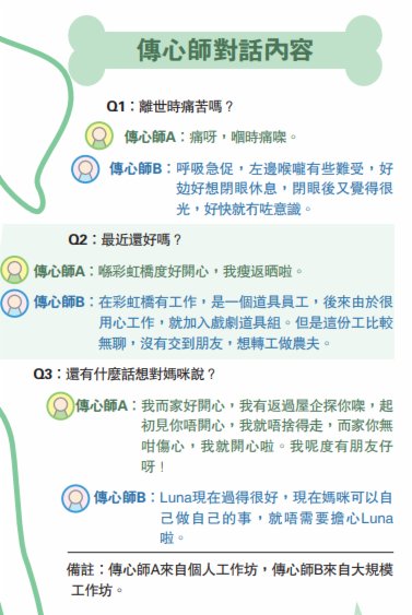 個人工作坊的傳心師透過WhatsApp聯繫記者,用寵物的第一身作回應,以簡單的幾句文字大致表示,Luna離世時感到痛苦,現在在彩虹橋很開心,還瘦了很多,曾經回家尋找主人。