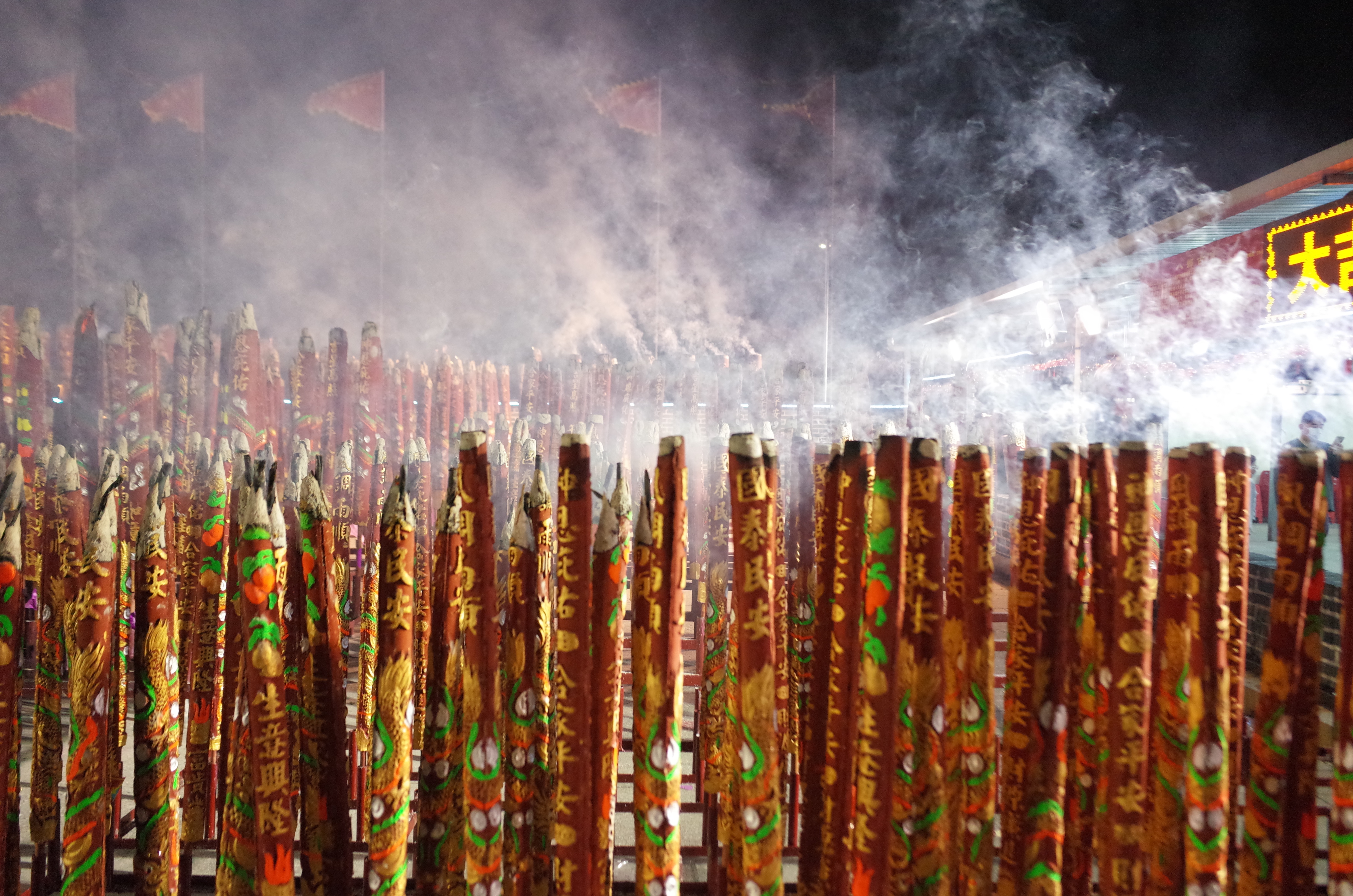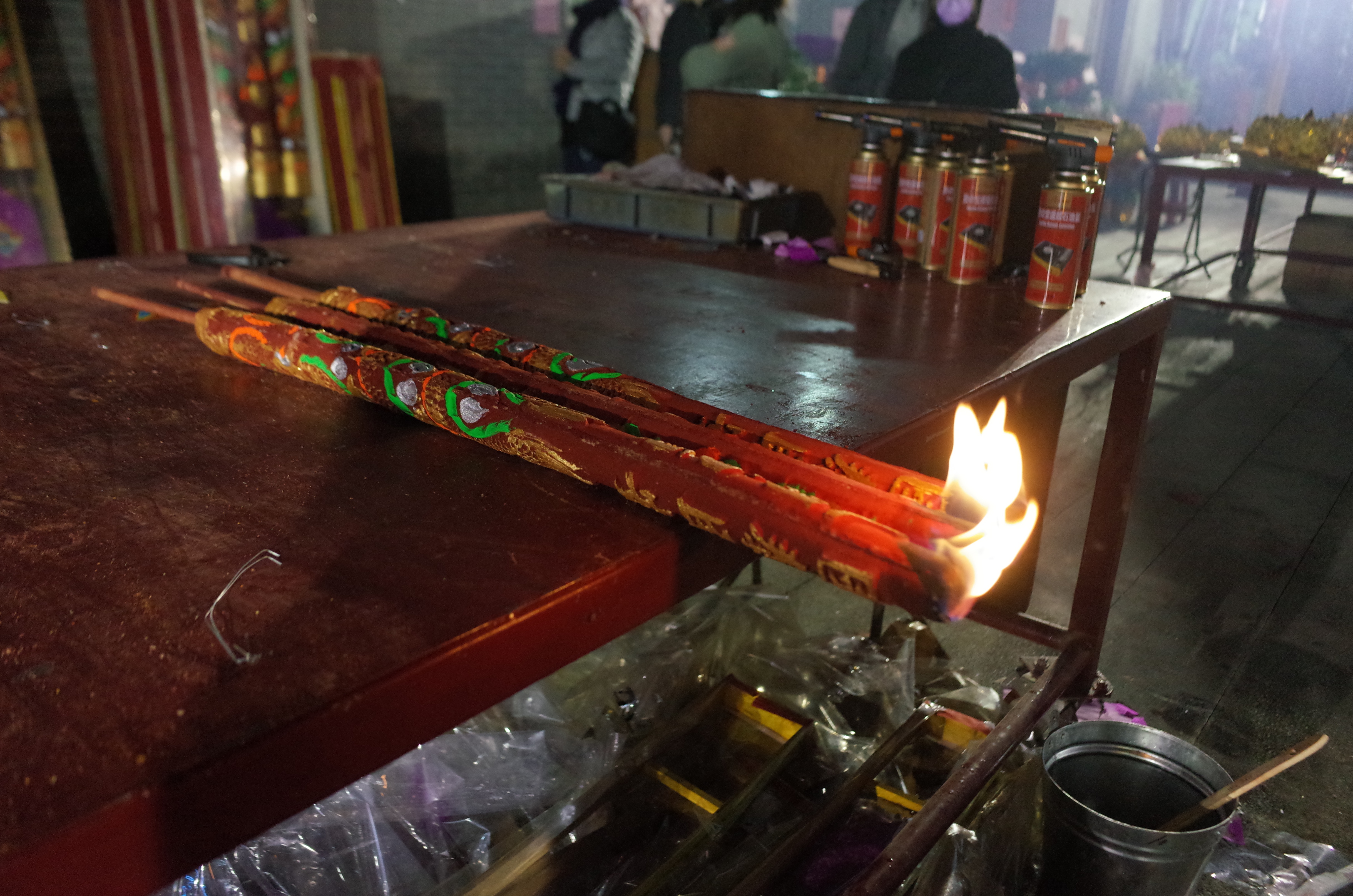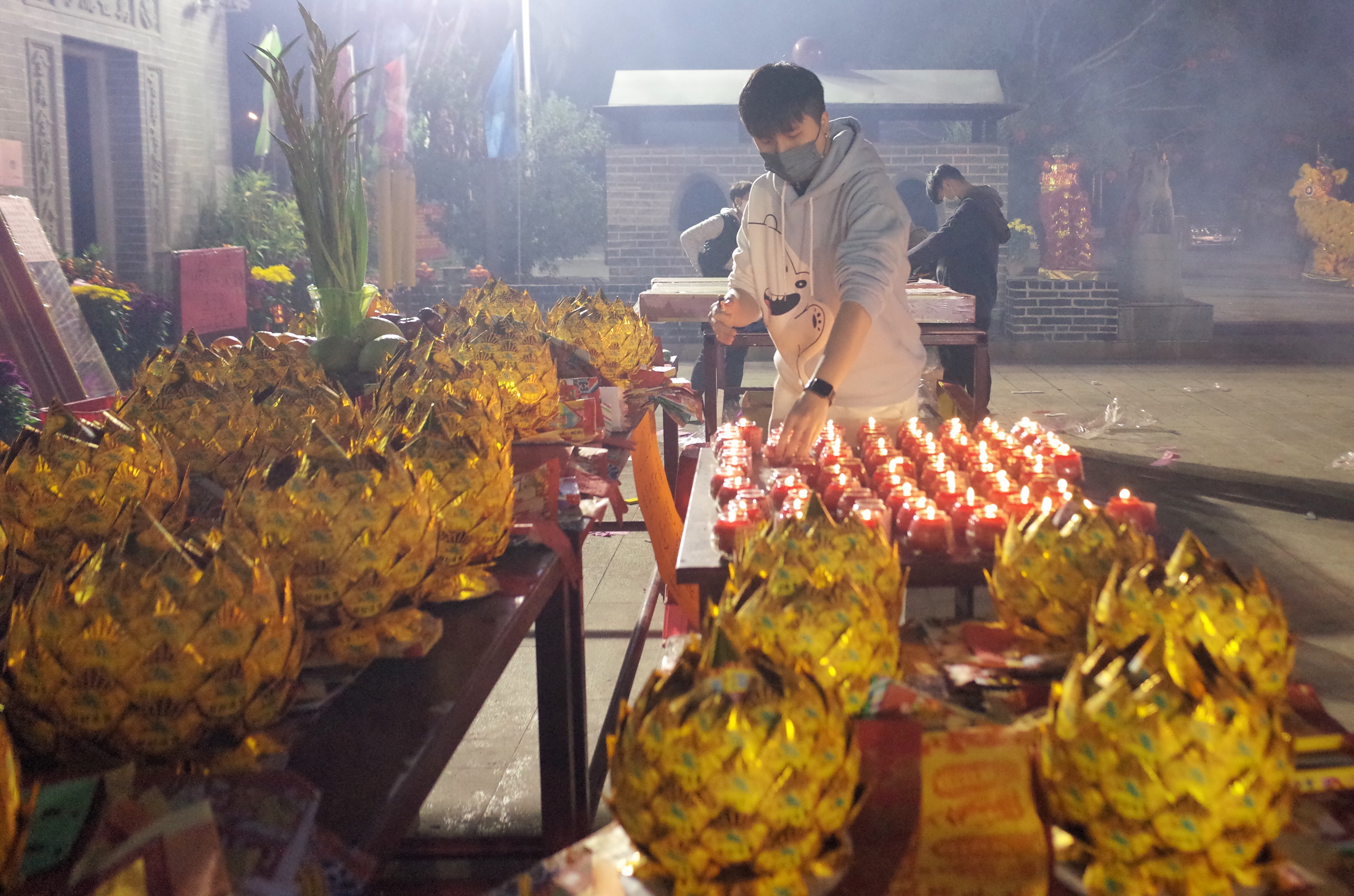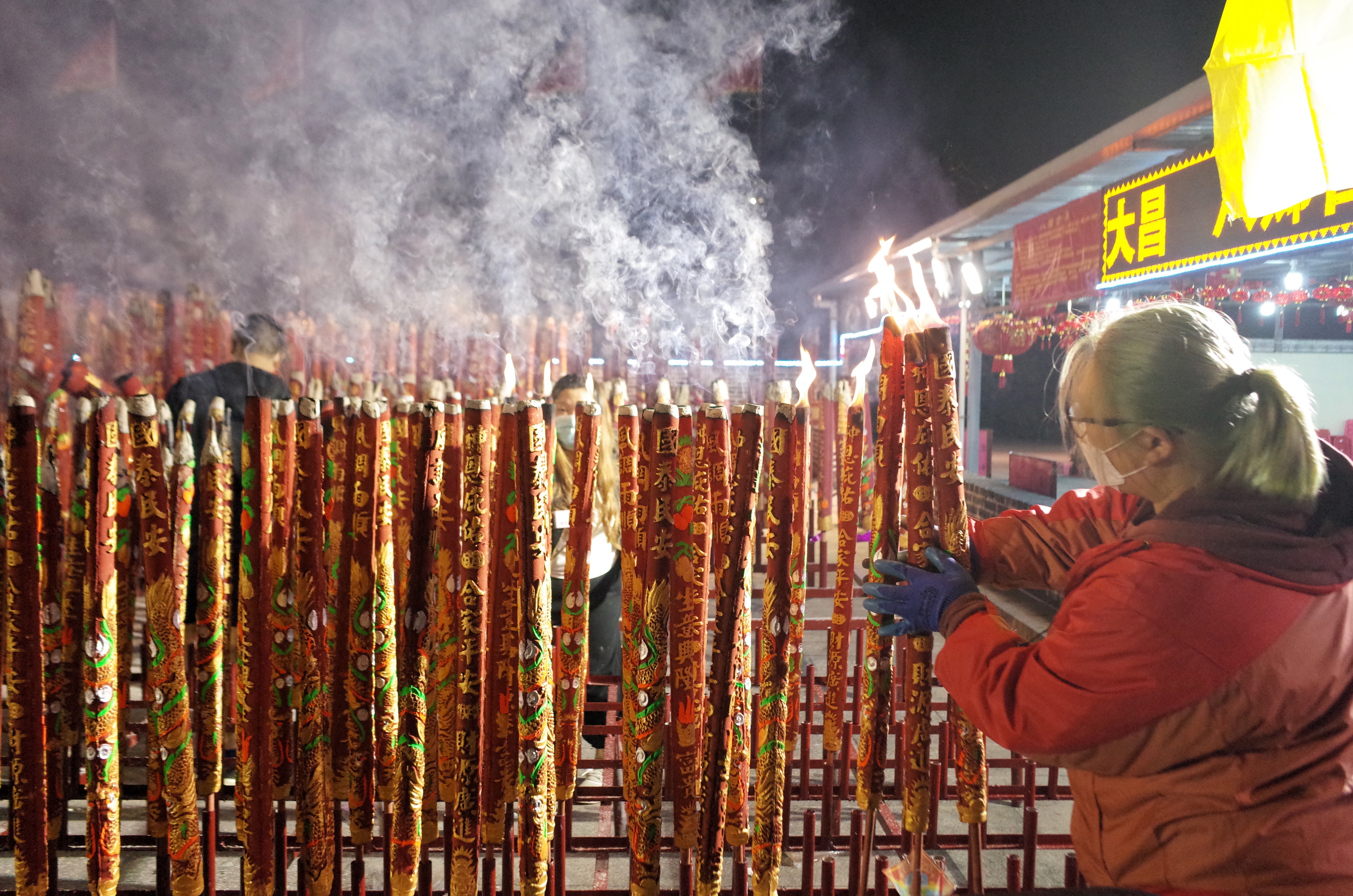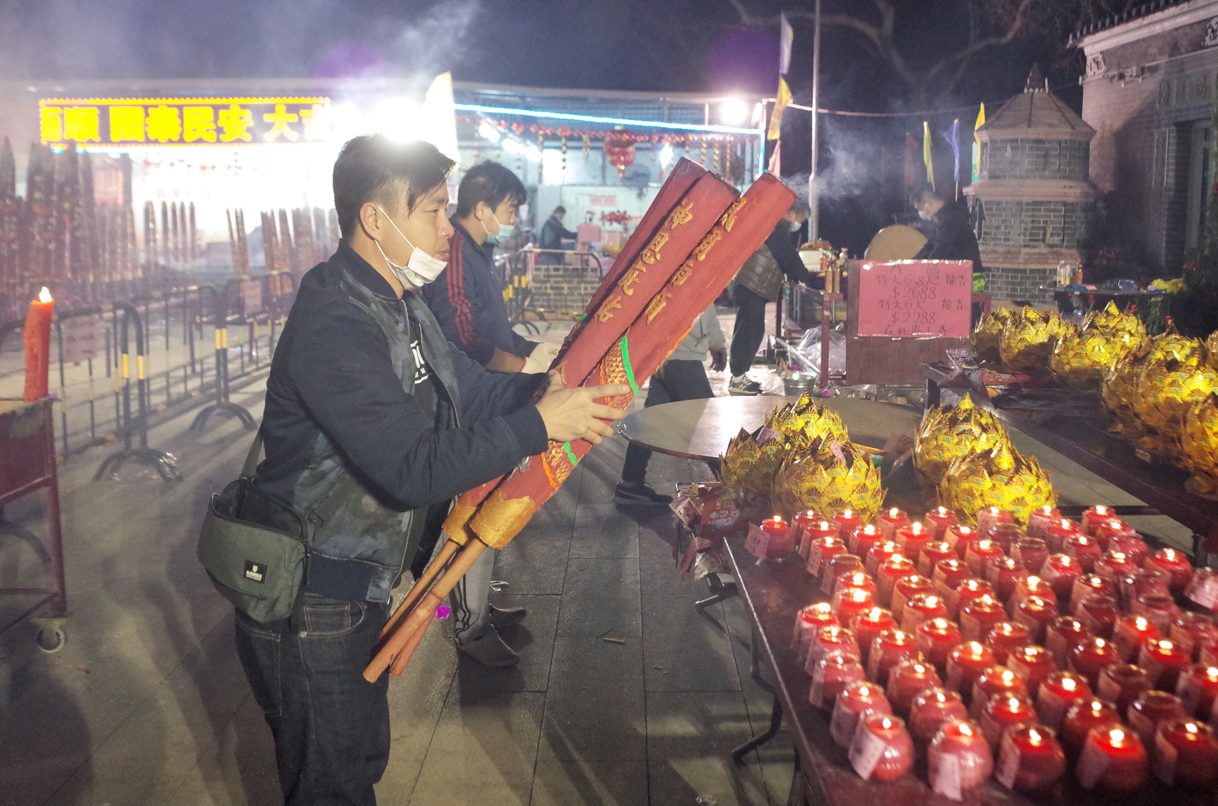 記者今天(1日)凌晨在錦田八鄉古廟看到,今年新年頭注香人流比往年少,頭注香由工作人員負責代善信裝插。