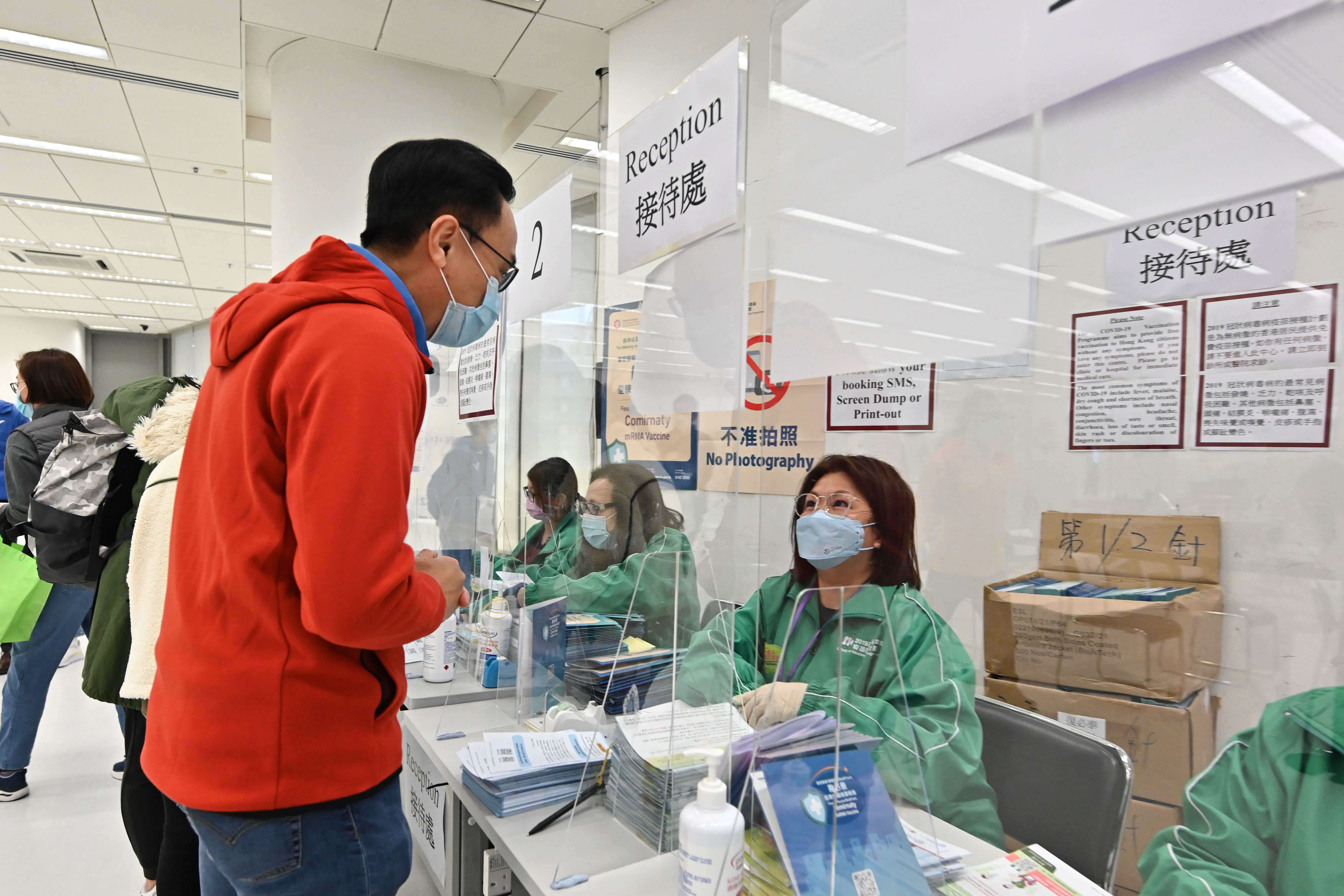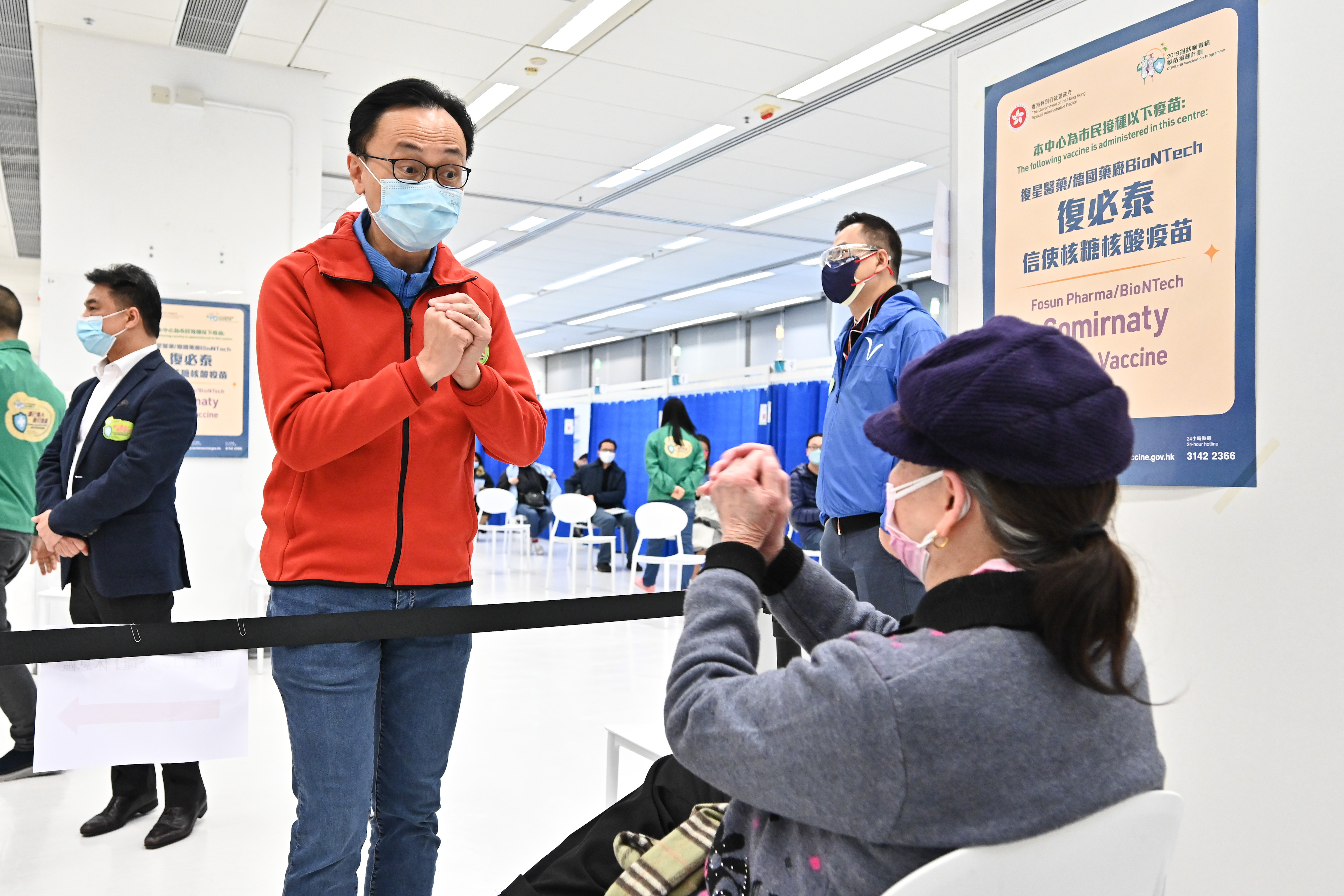 本港12間社區疫苗接種中心,提前在今日(3日)開始為市民提供接種服務,明日有更多接種點恢復運作。公務員事務局局長聶德權今日到教育局九龍塘教育服務中心社區疫苗接種中心,視察接種中心虎年首日運作情況,了解接種人士意見,感謝醫護和行政支援人員竭力為市民服務。