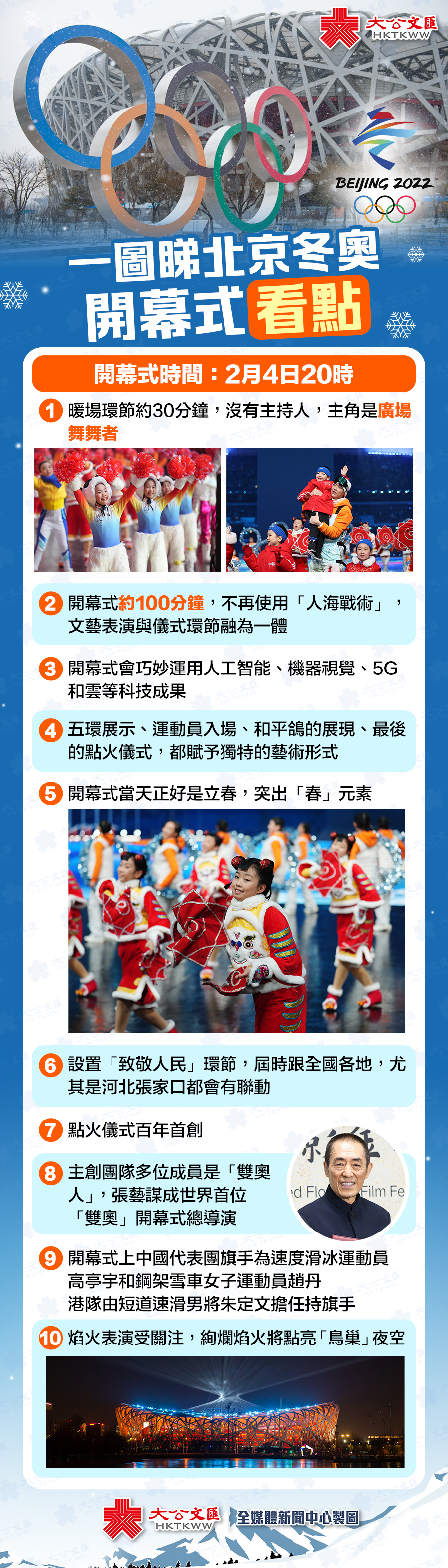 (大公文匯網 記者 張帥)北京2022年冬奧會將在2月4日晚開幕!開幕式在國家體育場「鳥巢」舉行,曾執導2008年奧運會開閉幕式的張藝謀再度擔綱,成為北京冬奧會和冬殘奧會開閉幕式總導演。記者獲悉,考慮到氣溫、防疫等因素,北京冬奧會的開幕式從時長和結構上都做了相應的調整,開幕式時長約100分鐘,不使用「人海戰術」,目標是「簡約且精彩」。開幕式點火方式有大膽的設計和變革,將成最大亮點。