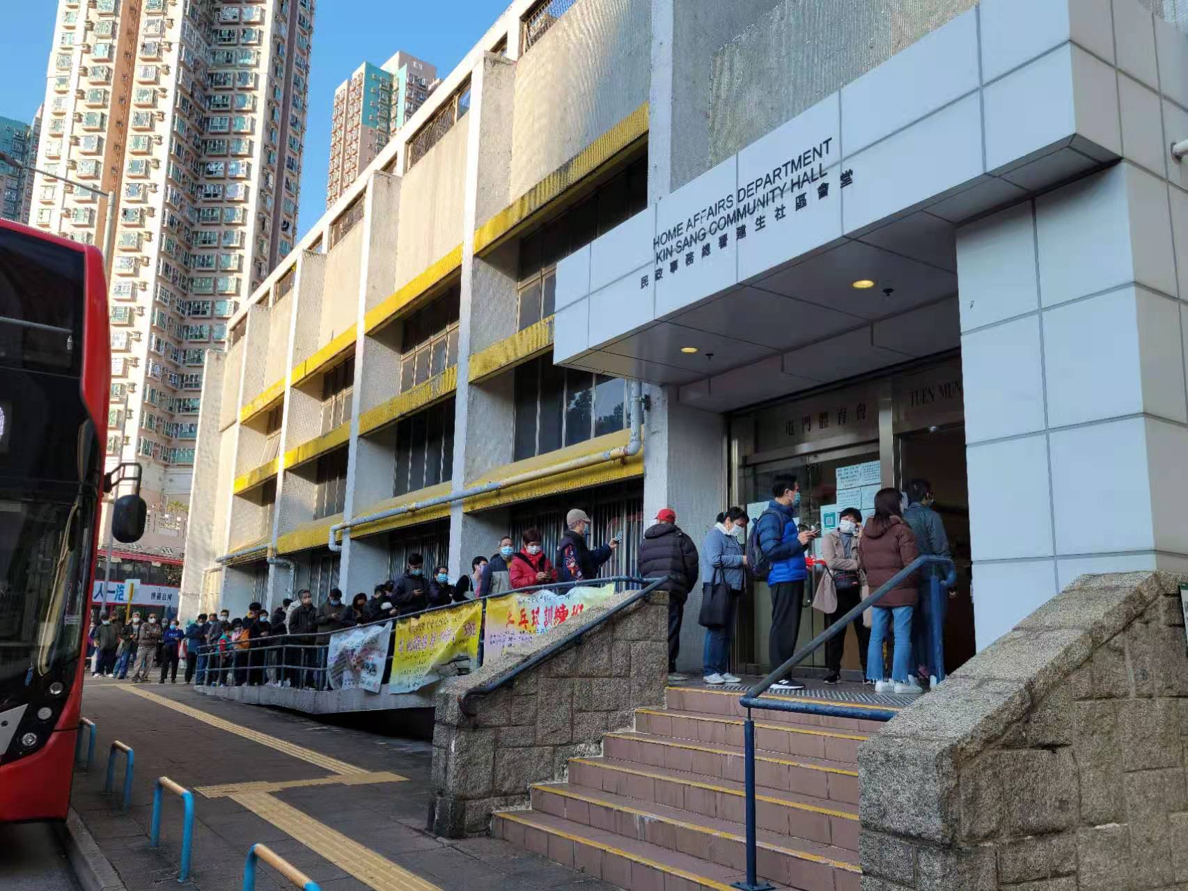 位於元朗朗日路9號的元朗市東社區會堂雖然開設了預約服務,可是仍有200名以上的市民在非預約隊伍中等候,有市民與家中長者一同在門外排隊約1小時仍未能成功進入檢測站,為免等待太久更自備椅子供長者休息,受訪的市民甘先生表示,昨天曾同樣到同一檢測站檢測,當時等候時間更長,今天的情況已有改善。被問及對本港疫情的展望,甘先生認為第五波疫情正好在農曆新年爆發,雖然政府已多次呼籲減少跨家庭的活動,可是市民不可能因此完全停止外出拜年,即使減少拜訪次數,可是跨家庭的團年活動將無可避免,預計新年後數字可能繼續上升,對疫情前景不樂觀。