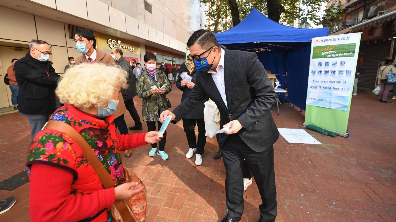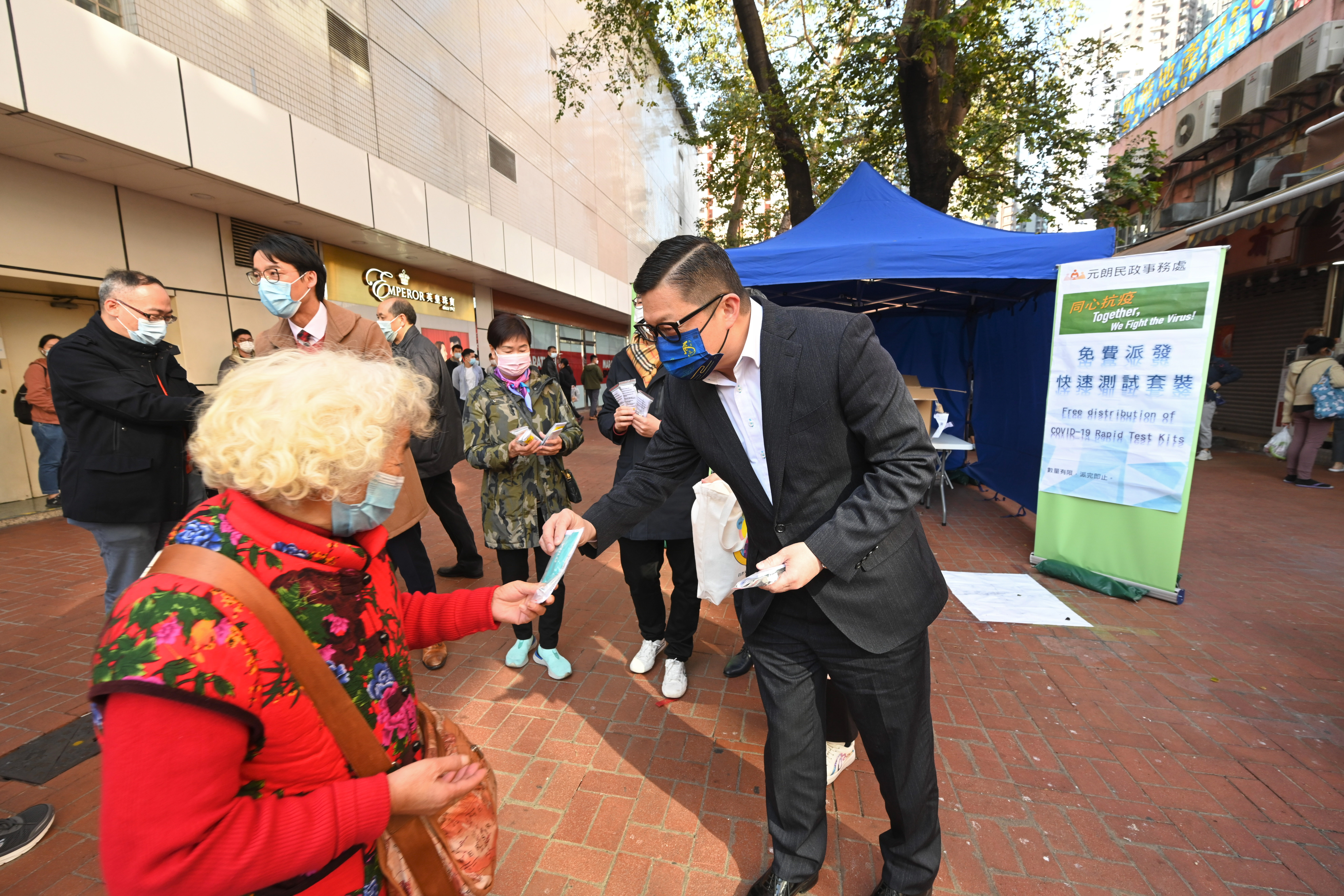 大公文匯全媒體報道,本港第五波疫情嚴峻,今日(4日)新增130宗本地感染個案,包括59宗源頭不明個案,佔本地個案的45%,再創新高。因應上星期元朗採集到對新冠病毒呈陽性的污水樣本,保安局局長鄧炳強今日到元朗安達坊,派發1000套快速測試套裝予市民。