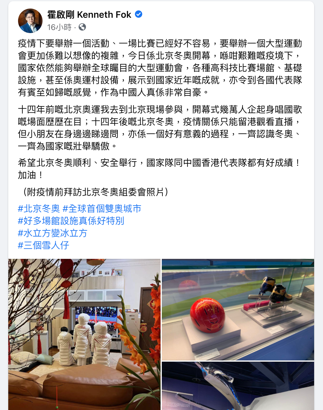 大公文匯全媒體報道,2022年北京冬奧會開幕式昨日(4日)在北京舉行。霍啟剛在其個人社交平台發布與三個子女共同觀看開幕式的照片,他在帖文中寫道,「十四年前嘅北京奧運我去到北京現場參與,開幕式幾萬人企起身唱國歌嘅場面歷歷在目;十四年後嘅北京冬奧,疫情關係只能留港觀看直播,但小朋友在身邊邊睇邊問,亦係一個好有意義的過程,齊認識冬奧、齊為國家嘅壯舉驕傲。」