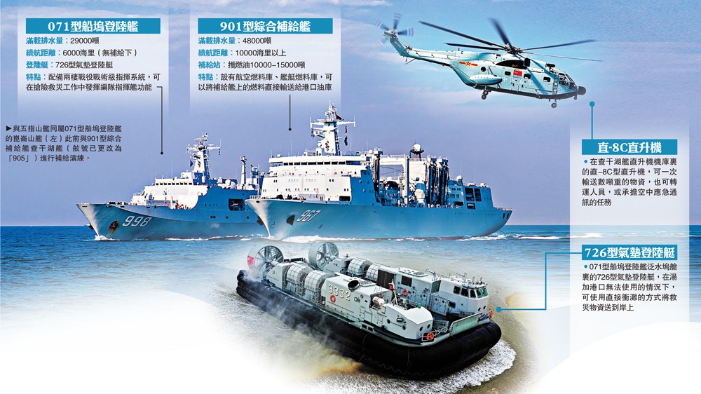 在中國海軍現役艦艇體系中,071型船塢登陸艦和901型綜合補給艦都佔據特殊地位。前者是僅次於航空母艦及075型兩棲攻擊艦的戰鬥艦艇;後者則是最大的輔助艦艇,有航母「超級奶媽」之稱,是海軍遠洋編隊不可或缺的重要力量。