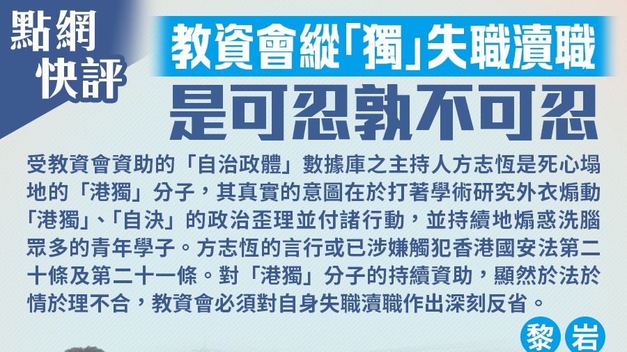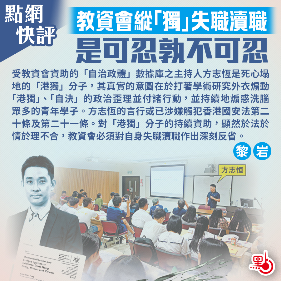 受教資會資助的「自治政體」數據庫之主持人方志恆是死心塌地的「港獨」分子,長期披著學術研究外衣煽動「港獨」、「自決」的政治歪理並付諸行動,並持續地煽惑洗腦荼毒眾多的青年學子。方志恆的言行或已涉嫌觸犯香港國安法第二十條及第二十一條。對「港獨」分子的持續資助,顯然於法於情於理不合,教資會必須對自身失職瀆職作出深刻反省。