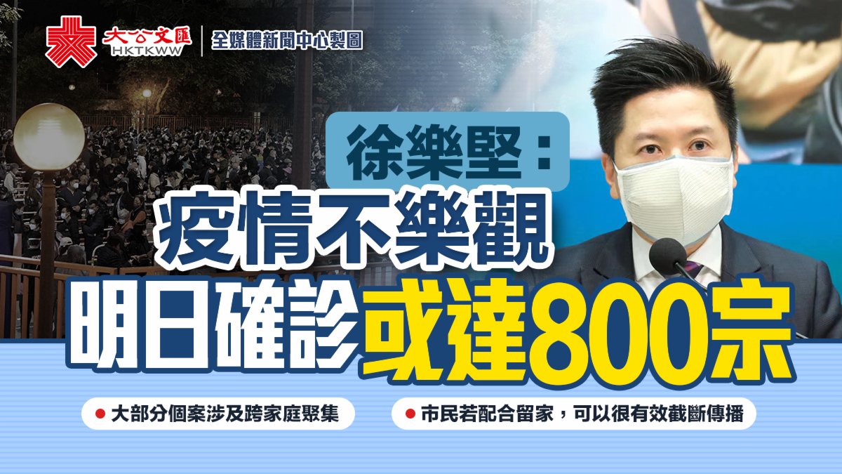 大公文匯全媒體報道,本港第五波疫情形勢危急,今日(7日)新增614宗確診,當中607宗為本地感染,其中457宗個案仍在調查感染源頭。衞生防護中心總監徐樂堅在疫情記者會上表示,現時疫情不樂觀,個案數目持續上升,大部分個案涉及跨家庭聚集,按目前數字推斷,昨日有逾300宗個案,今日有逾600宗,相信明日確診數字會更高,可能達至600至800宗。