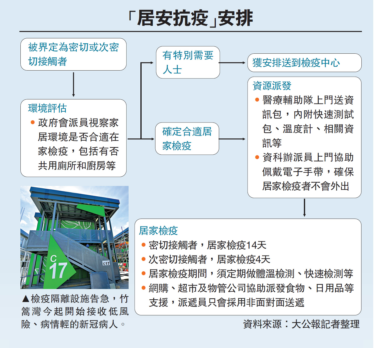 政府同時啟用「居安抗疫」計劃,紓緩檢疫設施壓力。密切接觸者及次密切接觸者分別改為14天及4天家居檢疫,醫療輔助隊將上門送資訊包,資科辦職員亦會上門協助佩戴電子手帶,確保受檢人士不會外出。