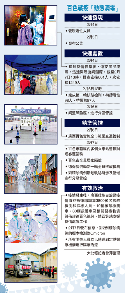 據廣西官方披露的數據,截至2月7日12時,廣西全區累計報告本輪疫情本土確診病例99例,均發生在百色市。2月4日,廣西百色市德保縣在對返鄉人員的檢測中,有1名深圳市寶安區石巖街道返鄉人員核酸檢測初篩結果呈陽性。經過數次覆核,當地首次發布關於發現陽性人員的公告。「本輪疫情發生後,廣西全區上下迅速行動,在百色市及德保縣組建區市縣三級聯合指揮部,三級聯動,扁平化運行,確保疫情處置工作精準高效運行。」廣西壯族自治區疫情防控指揮部疫情防控與醫療救治組副組長龐軍表示,利用大數據研判行動軌跡,提高了流調溯源的效率。截至2月7日13時,百色市累計排查本輪疫情的密切接觸者768人、次密切接觸者1205人,南寧市排查本輪疫情關聯病例的密接33人、次密接44人,均已按要求落實管控措施。